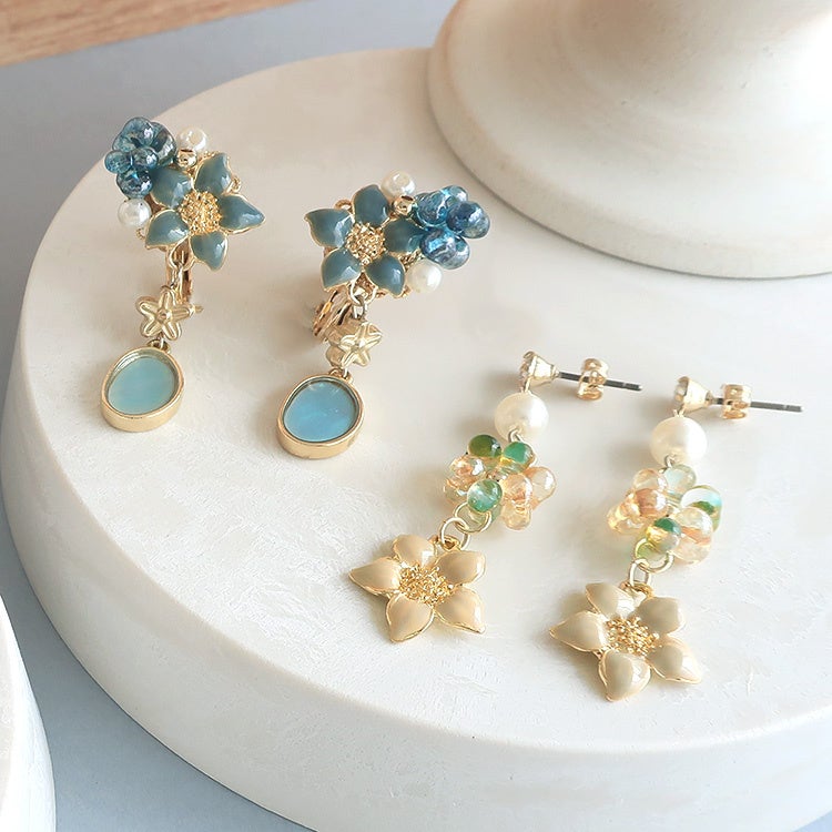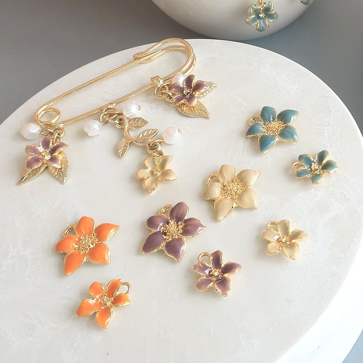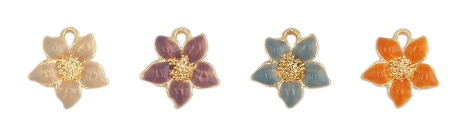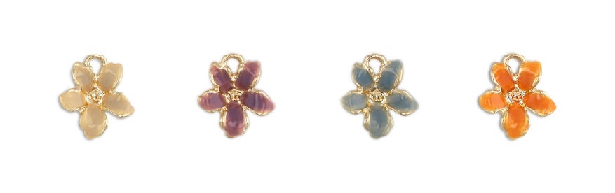 落ち着いたトーンの上品カラーが魅力のフラワーモチーフのカン付きメタルパーツ(チャーム)が登場いたしました。大小や色違いの組み合わせはもちろん、その他に相性の良いパーツと組み合わせることで幅広いバリエーション豊かなアクセサリーが作れます。