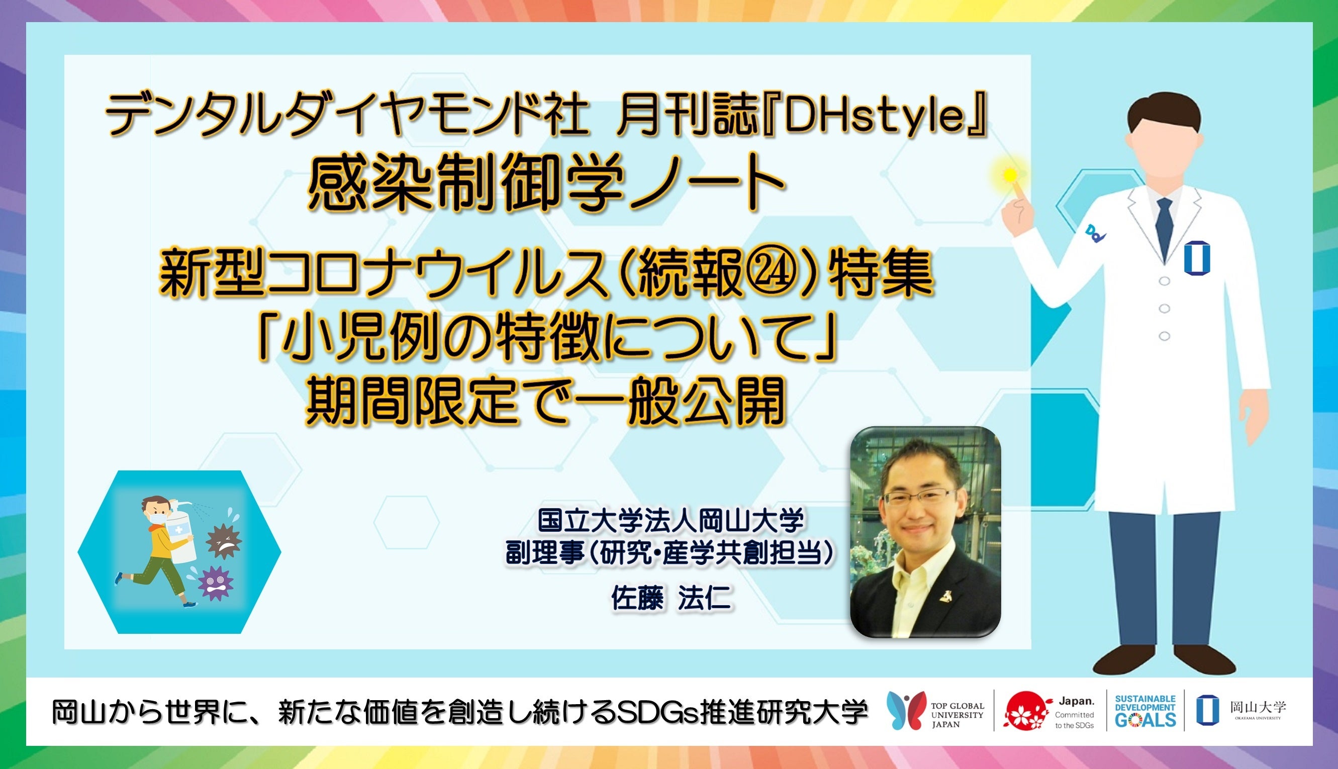 国立大学法人岡山大学(本部:岡山市北区、学長:槇野博史)東京オフィス駐在の佐藤法仁副理事(研究・産学共創担当)・URAは、歯科総合出版社である株式会社デンタルダイヤモンド社(本社:東京都文京区本郷、代表取締役:濵野優)が歯科衛生士向けに発行している月刊誌『DHstyle』に、連載「感染制御学ノート」を2012(平成24)年1月から行っています。