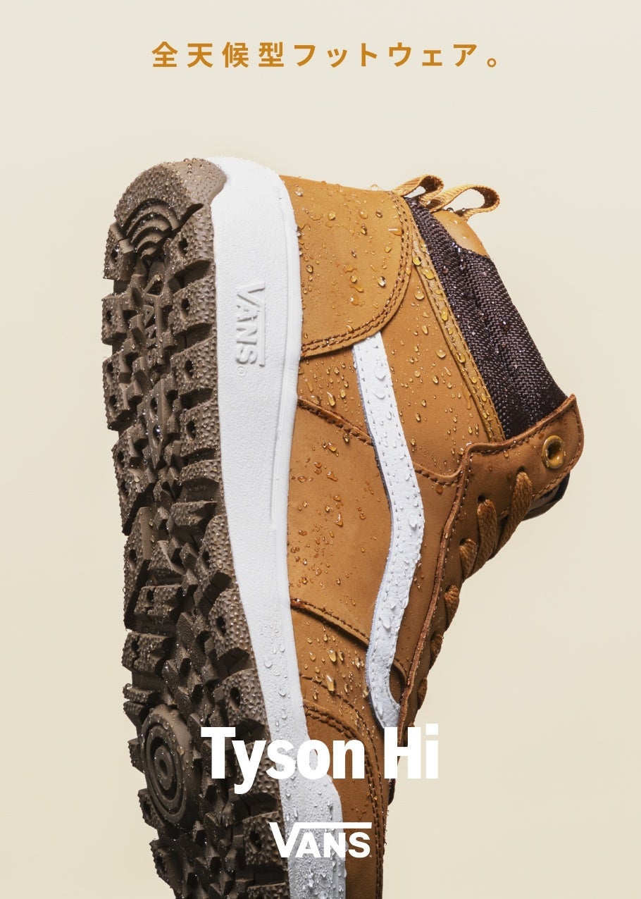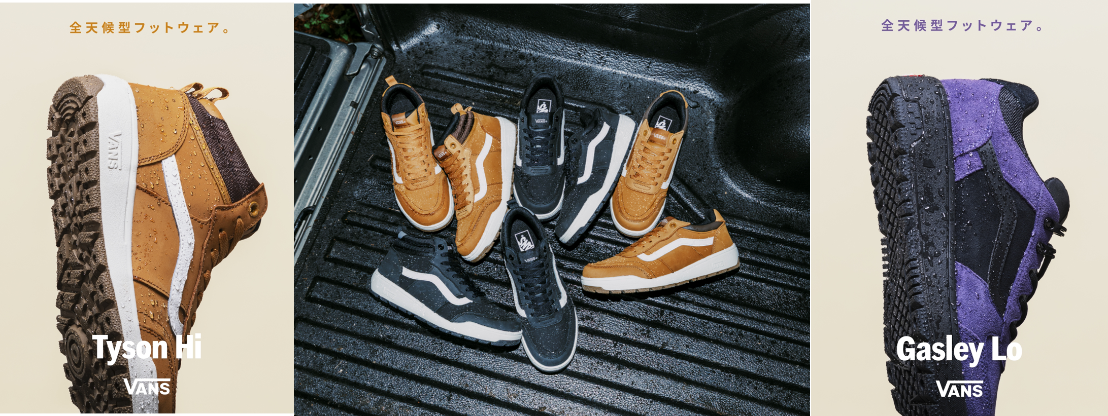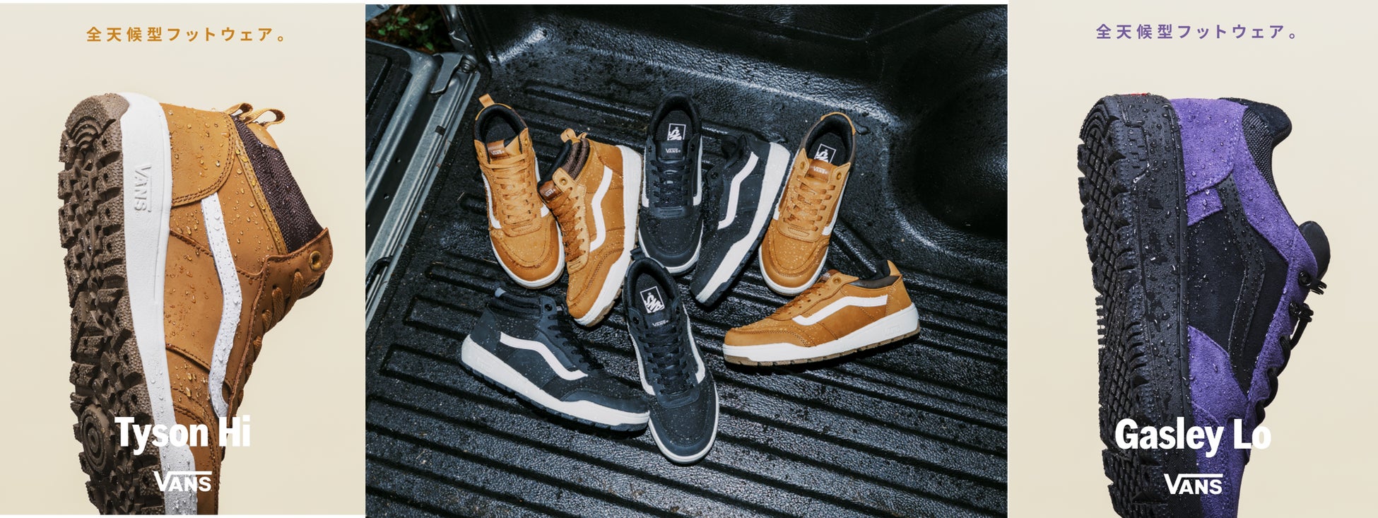 VANSブーツスニーカーは、カジュアルながらも表面撥水加工を施したアッパーや、雨の侵入を防ぐガゼット仕様のシュータンなど、日常からアウトドアまで活躍する高い防水性能を備えています。今回のビジュアルでは、悪天候の大自然を背景にした力強い世界観で、機能性とデザイン性の両立を表現しています。