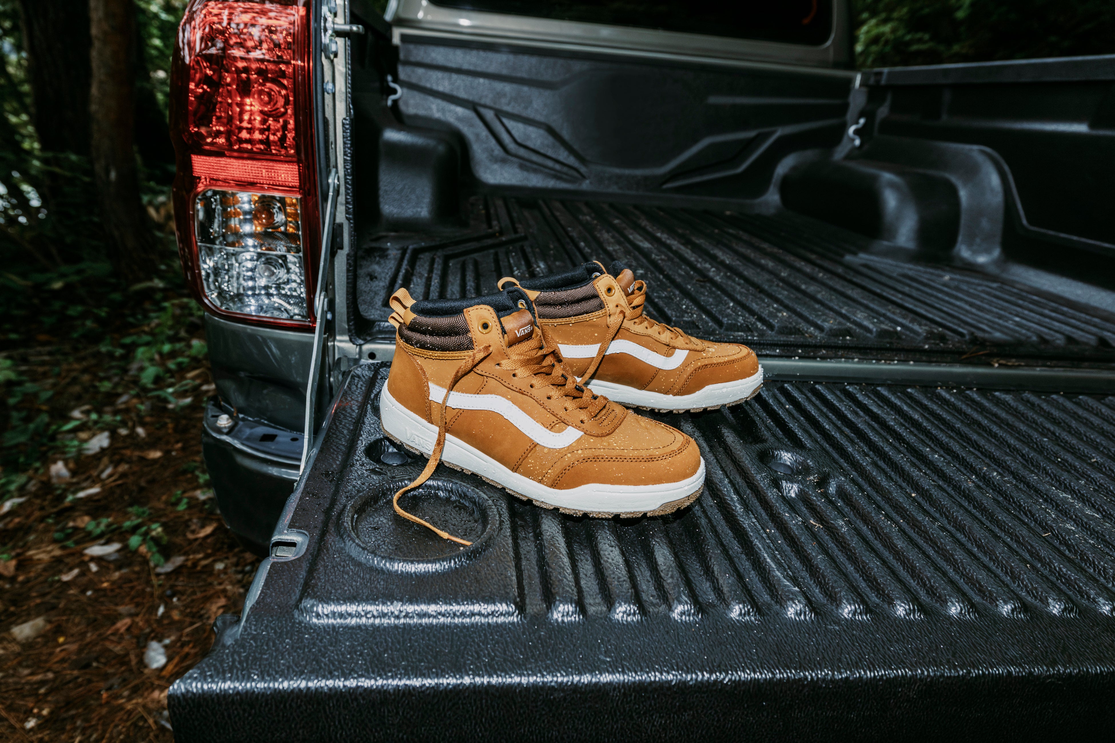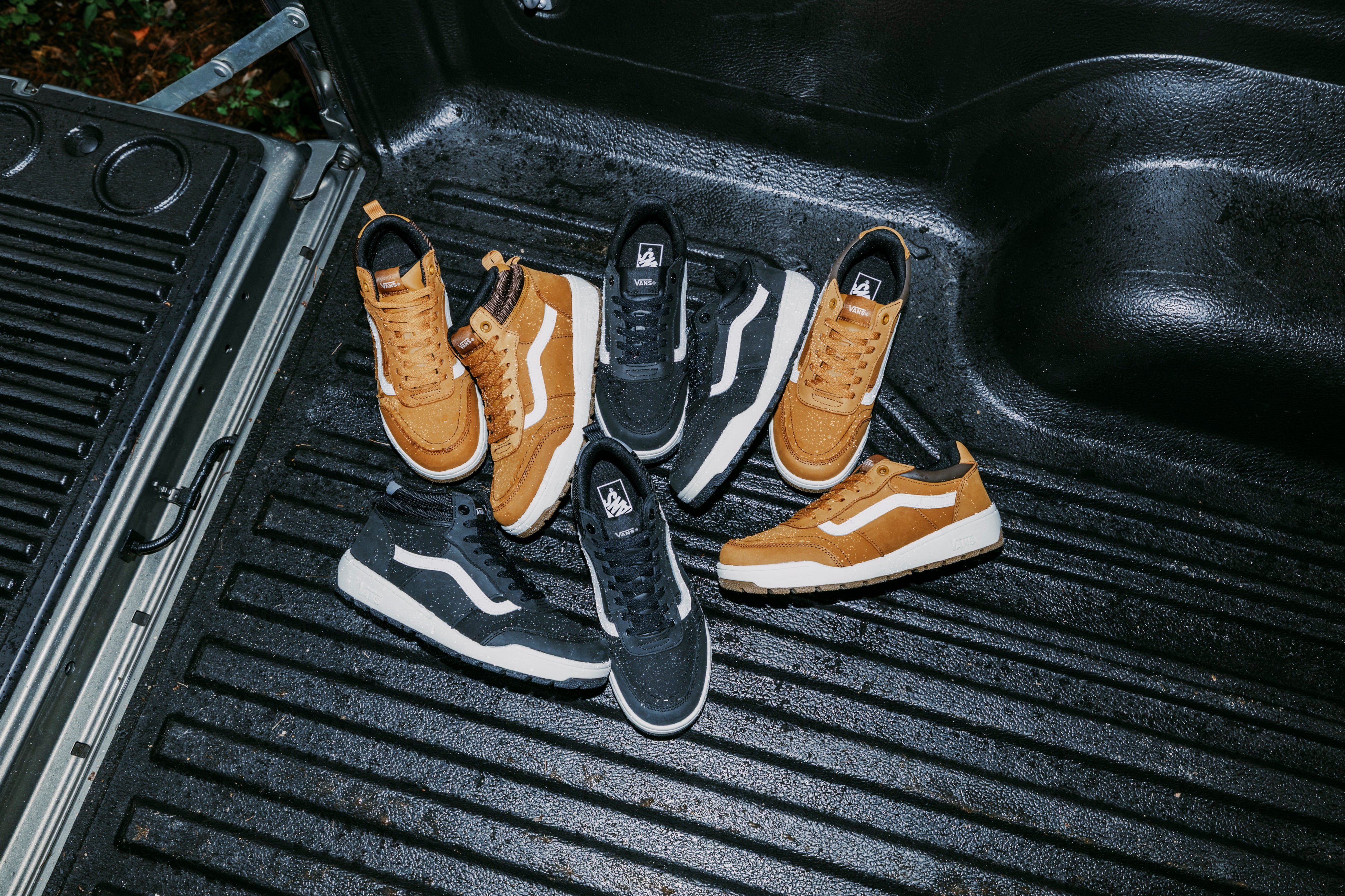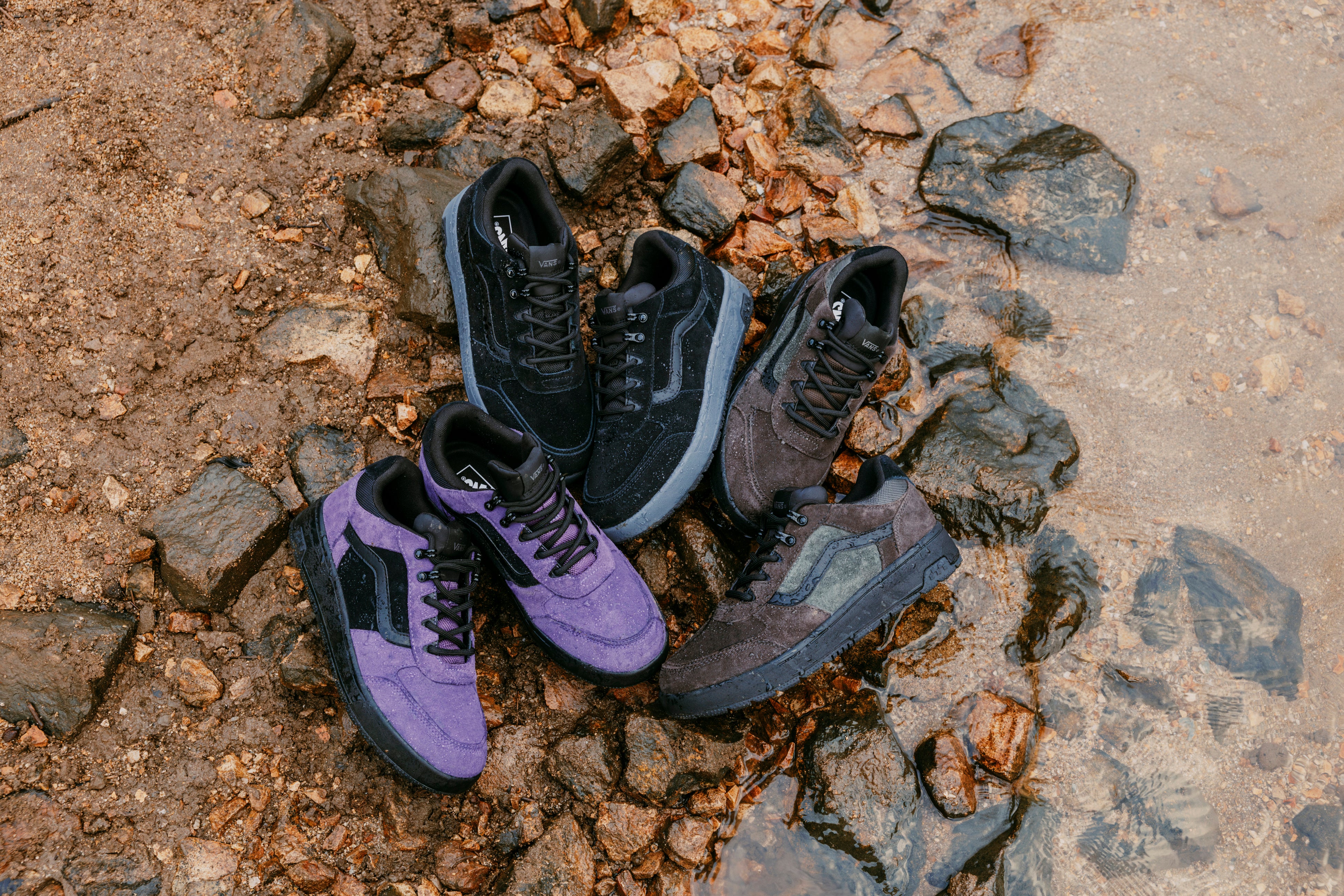 VANSブーツスニーカーは、カジュアルながらも表面撥水加工を施したアッパーや、雨の侵入を防ぐガゼット仕様のシュータンなど、日常からアウトドアまで活躍する高い防水性能を備えています。今回のビジュアルでは、悪天候の大自然を背景にした力強い世界観で、機能性とデザイン性の両立を表現しています。
