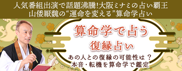 大阪ミナミの占い覇王として数々の番組やメディアで人気を博している山倭厭魏(やまとおうぎ)による本格算命学サイト『山倭厭魏の算命学』にて、この度『算命学で占う復縁占い』を無料公開いたしました。あなたとあの人の生年月日を入力するだけで、2人の相性や復縁可能性、あの人の未練や本音を占うことができます。