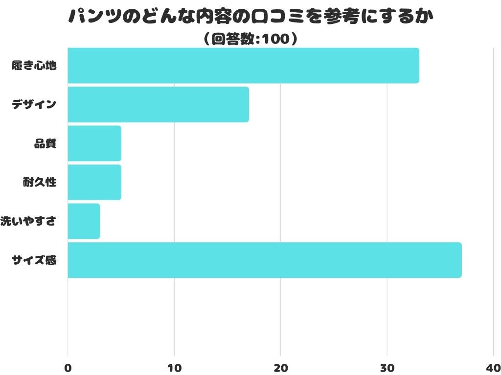 パンツのどんな内容の口コミを参考にするかをアンケートにて調査したところ、1位は「サイズ感」でした。