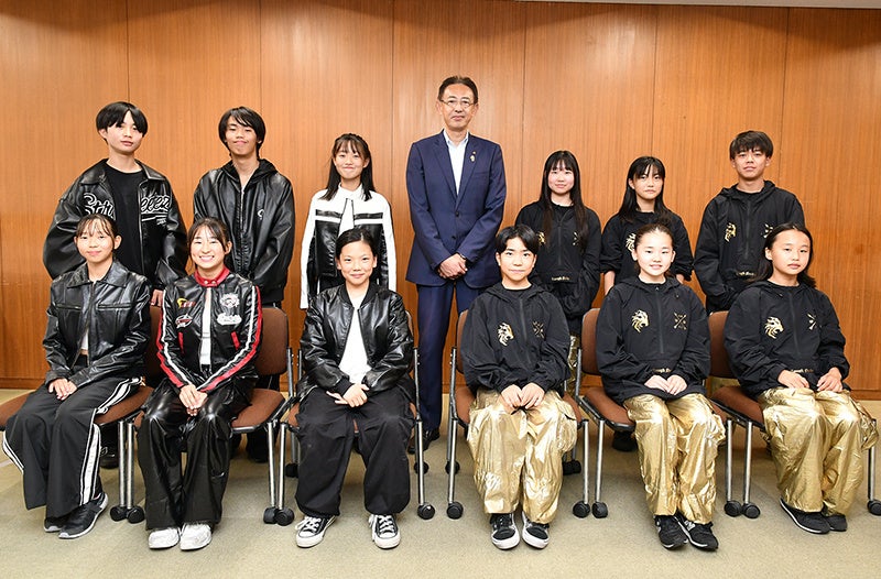 この日、12人は世界大会出場報告のため市役所を訪問。それぞれのチームを代表し、臼井優菜さんと足立葵叶さんは、「世界一になれるように頑張ります」「練習の成果を十分に発揮したいです」と大会出場への意気込みを力強く話し、濱田市長は「両チームの健闘を祈っています」と選手たちを激励しました。