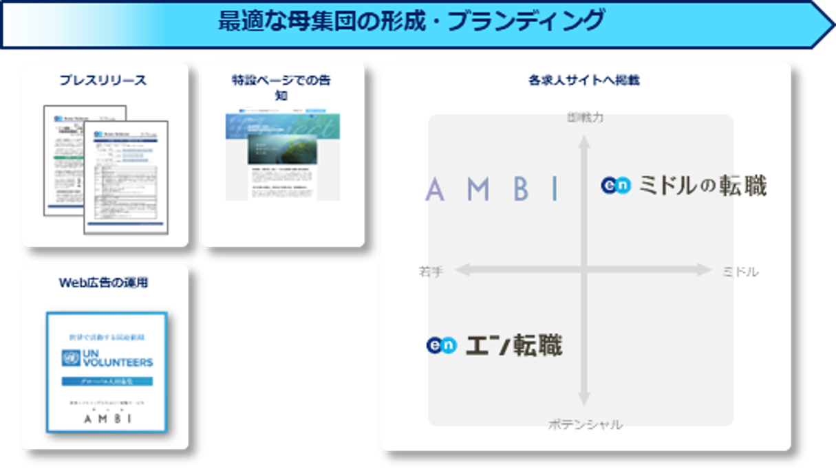 プレスリリースや特設ページ、Web広告での告知に加え、各求人サイトでの集客サポートを実施いたします。『エン転職』『AMBI』『ミドルの転職』とターゲットの異なる3つの求人サイトを活用することで、ターゲットへ網羅的に求人を届けます。