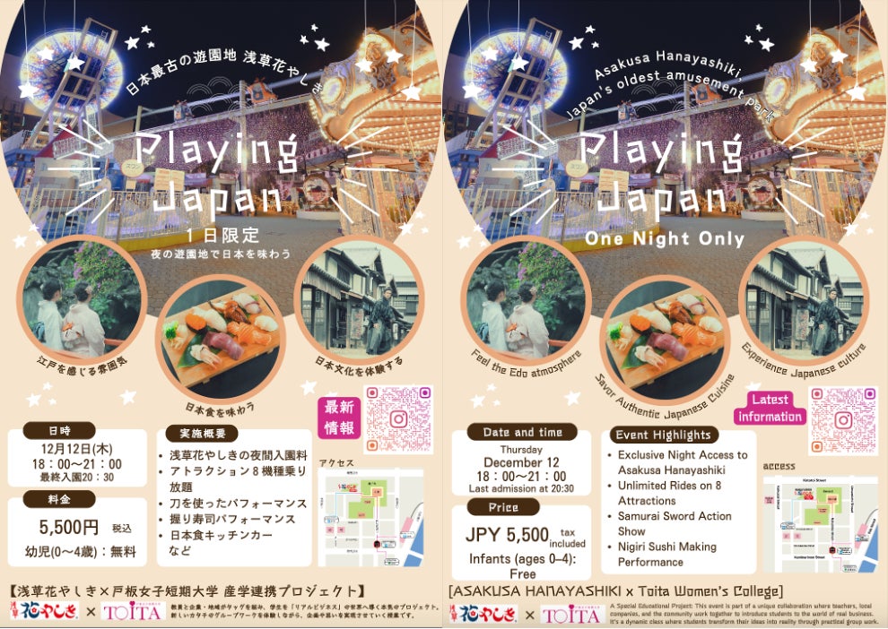 株式会社シンクロ・フード(本社:東京都渋谷区、代表取締役:藤代真一、東証プライム市場:3963)が運営するキッチンカーのプラットフォーム「モビマル」は、戸板女子短期大学(略称:戸板女子短大、東京都港区)に「浅草花やしき」が依頼した「花やしきへのインバウンド集客」を目的とする戸板女子短大考案イベント「Playing Japan」を企画段階からイベント実施までサポート。浅草花やしきにて12月12日(木)に開催します。