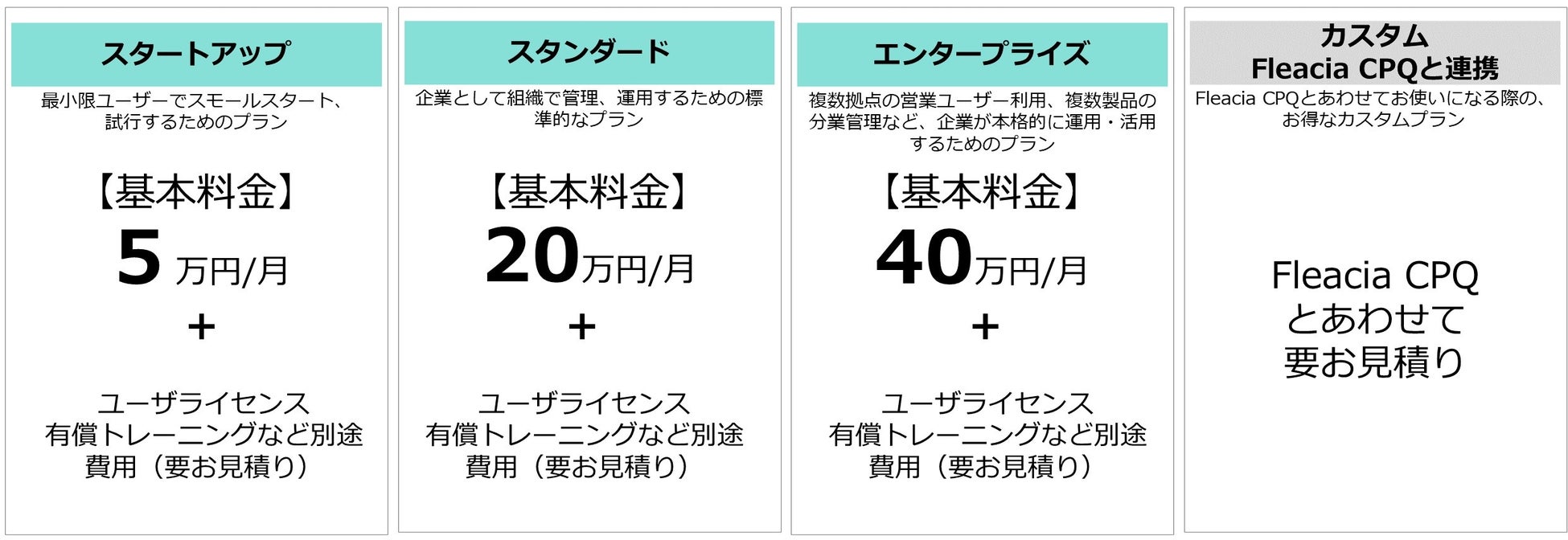 「Fleacia Product Selector」は3つの単体契約プランと、「Fleacia CPQ」とあわせてご契約いただくことでお得になるカスタムプランをご用意しています。