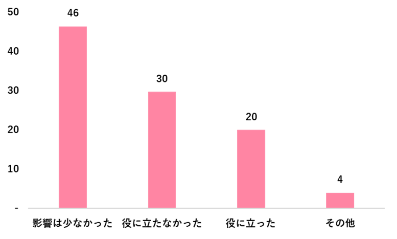 英語を学んだ経験が自身のキャリアに役立ったかについて、「影響は少なかった」が46%、「役に立たなかった」が30%だった。一方、「役に立った」は20%となり、自由回答では「論文の読み書きができる」「外資系企業に就職できた」「海外赴任や海外出張に役立った」といった経験談が挙げられた。