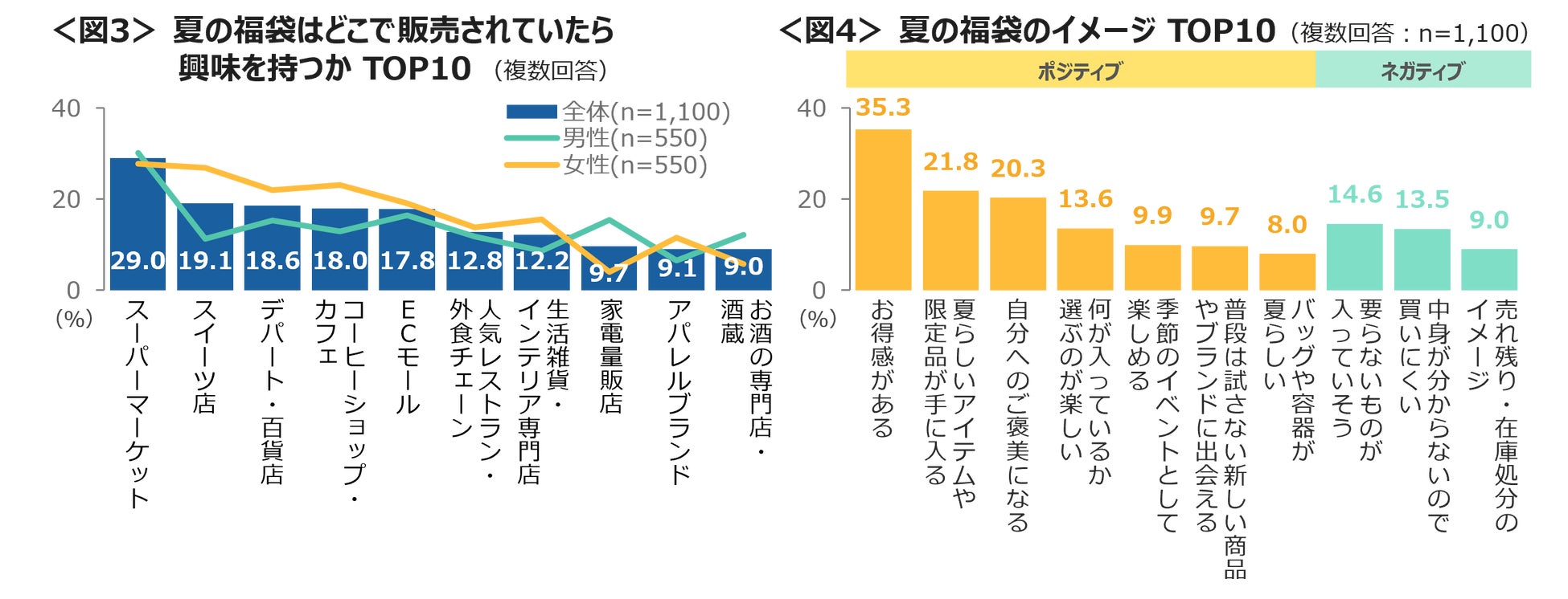 夏の福袋は、「お得感がある」「夏らしいアイテムや限定品が手に入る」「自分へのご褒美になる」が2~3割台で好意的なイメージをもたれている。<図4>