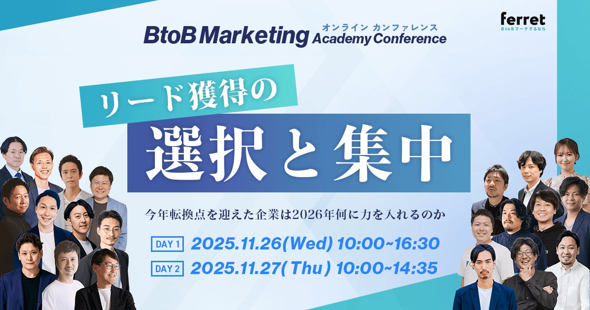 BtoBマーケティングのお困りごとをまるっと解決するサービス『ferret(フェレット)』を運営する株式会社ベーシック(本社:東京都千代田区、代表取締役:秋山勝)は、2025年11月26日(水)・27日(木)に自社主催のカンファレンス「BtoB Marketing Academy Conference リード獲得の“選択と集中”」を開催いたします。