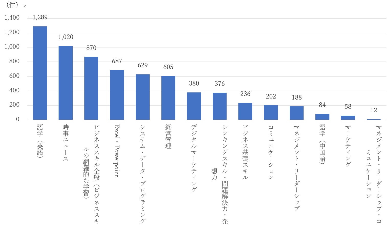 ・ニーズの高かった研修プログラムカテゴリとしては、語学(英語)、時事ニュース、ビジネススキル全般(ビジネススキルの網羅的な学習)、Excel/Powerpoint、システム・データ・プログラミング、経営管理、デジタルマーケティング。
