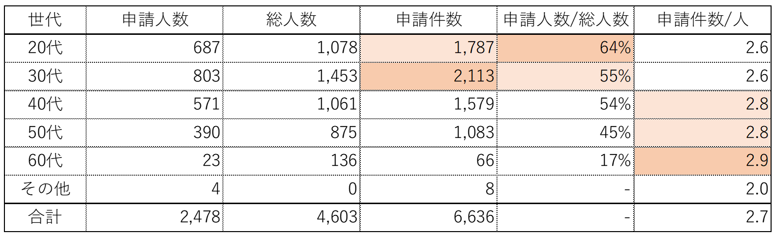 ・年代別総人数あたりの申請人数では、20代が64%で最も多く、次いで30代で55%。