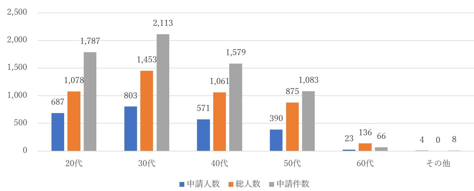 ・申請件数で最も多かったのは30代で2,113件、次いで20代で1,787件。