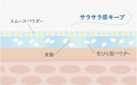 肌をなめらかに整えるスムースパウダー*3と、皮脂を吸着する花びら型のパウダー*4により、崩れにくく、メイクしたての仕上がりを長時間維持します。