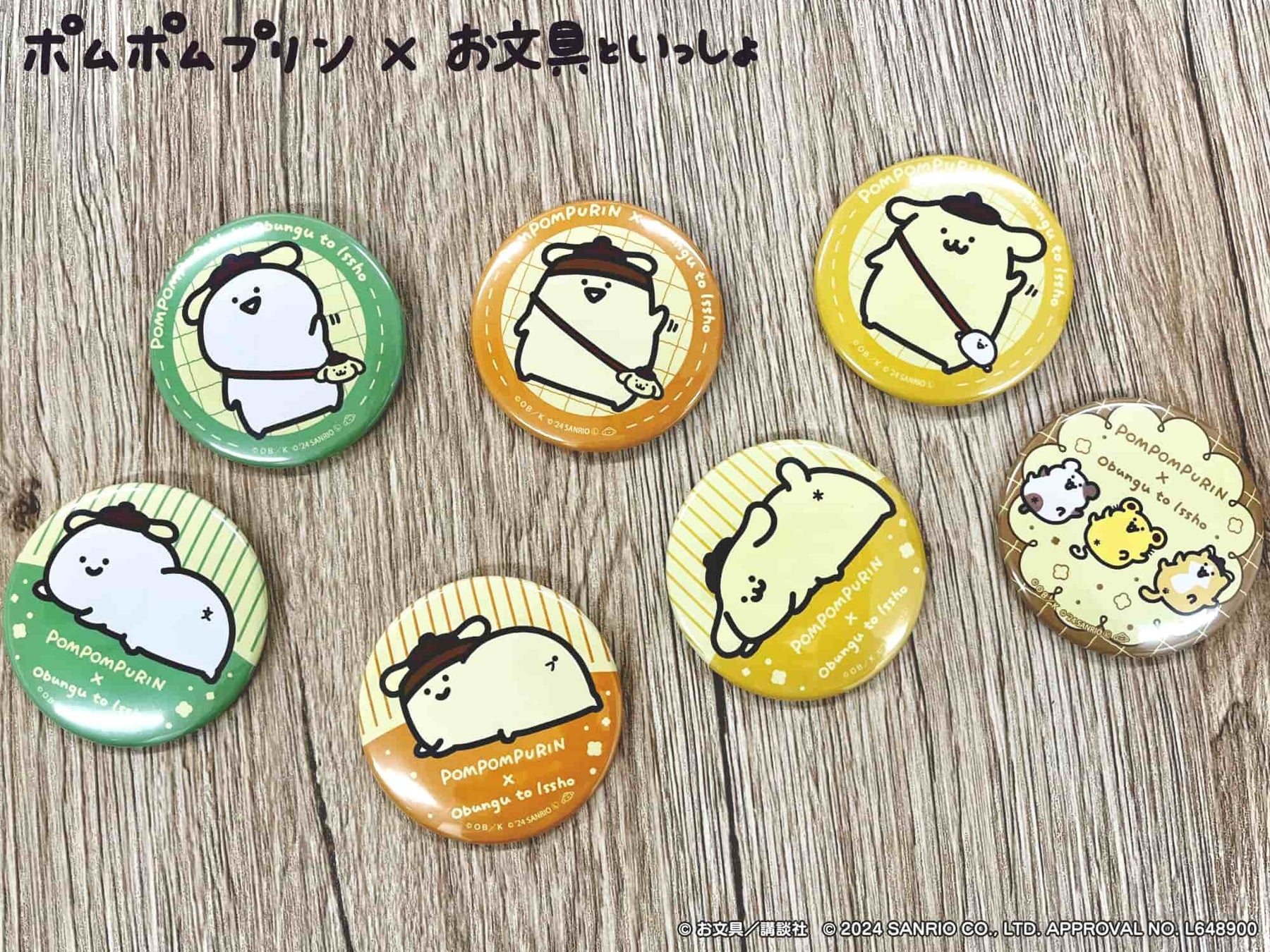 くすみカラーが可愛い落ち着いた雰囲気の缶バッジは直径5.7cm。お文具さんとポムポムプリンたちがこちらに手を振っている姿や、寝そべっている姿にほんわか癒されます。デザイン違いで集めたくなってしまう愛らしさ……!