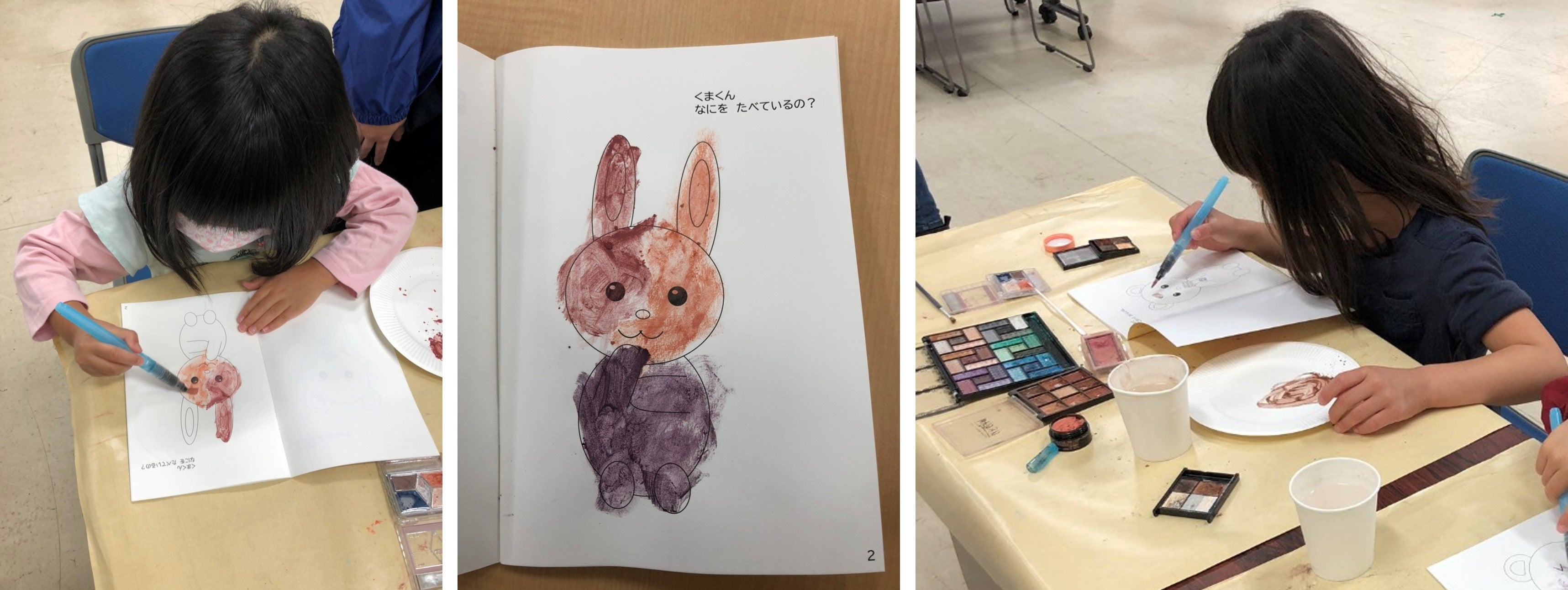 使わなくなったコスメを絵の具に変える特殊な液体(株式会社モーンガータ提供のSminkArtのmagic water)を使ってお絵かきするコーナーにおいて、ぬりえ絵本を使用したほか、保護者の方にはリーフレットを配布しました。