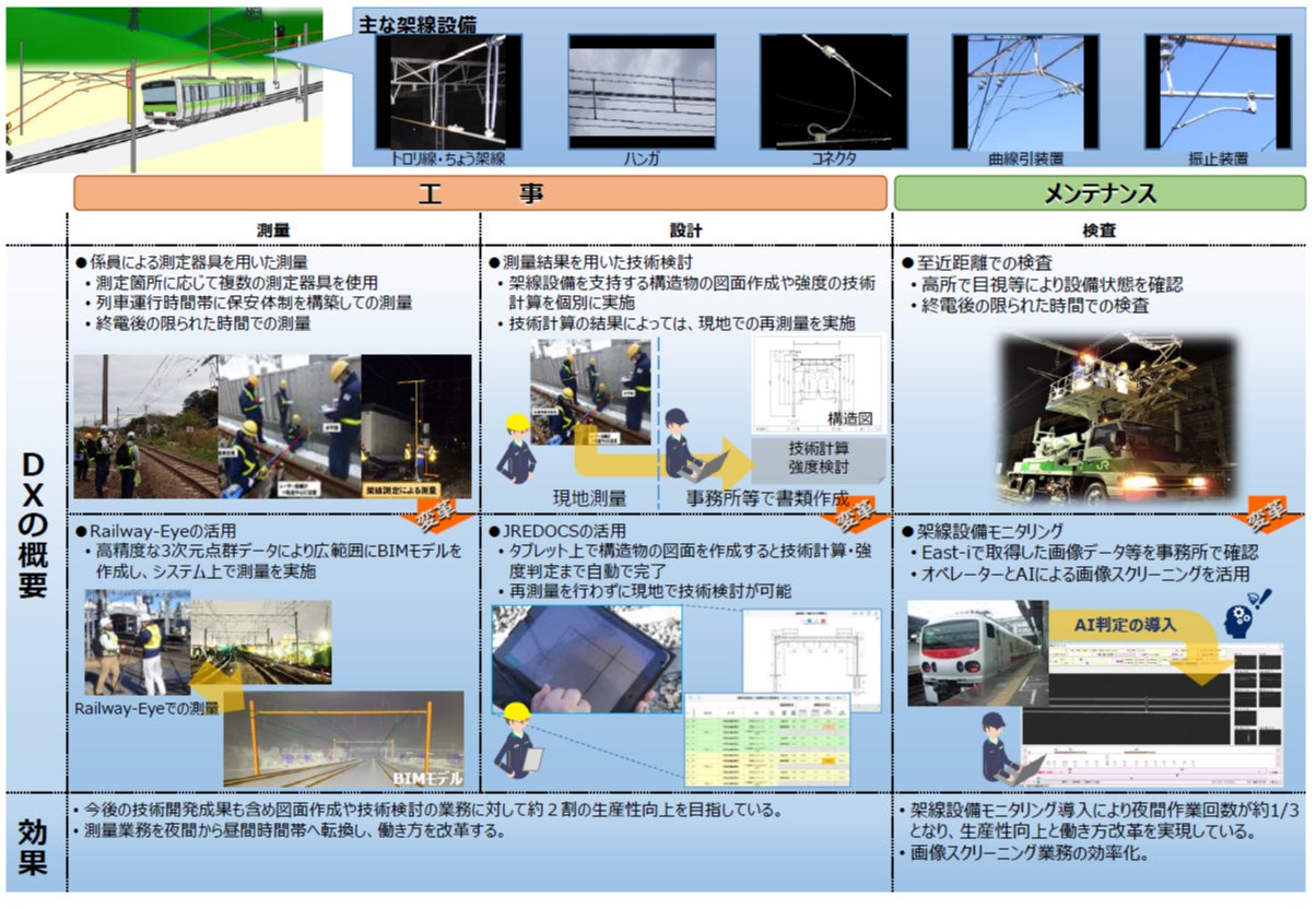 ○JR東日本では、架線設備※1の工事やメンテナンスにICTなどの先端技術を活用し、安全・安定輸送のさらなるレベルアップや将来の労働人口減少を見据えた業務のDXを推進しています。 ○架線設備の工事では、3Dレーザースキャナーや強度計算アプリを活用した測量や設計のDXを推進しています。 ○架線設備のメンテナンスでは、2021年10月より電気・軌道総合検測車(以下「East-i」)搭載のカメラおよびセンサーで取得した画像などのデータによる架線設備検査「架線設備モニタリング」の導入により、DXを推進しています。2023年度下期からは、取得した画像などのデータのAIによる画像スクリーニング※2を順次導入します。 |