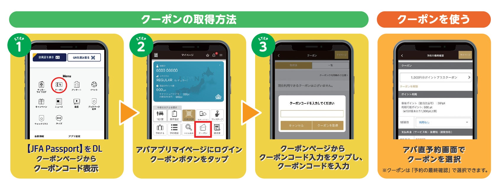 JFA公式アプリ『JFA Passport』で取得できるクーポンコードで、「アパ直(公式サイト・アプリ)」予約時に使える「500円割引クーポン」などをプレゼントします。まだ、アパアプリを使っていない方は、アパアプリ初回ログイン500ptプラスとW特典となり、2024年3月21日(木)~12月31日(火)期間で開催します。