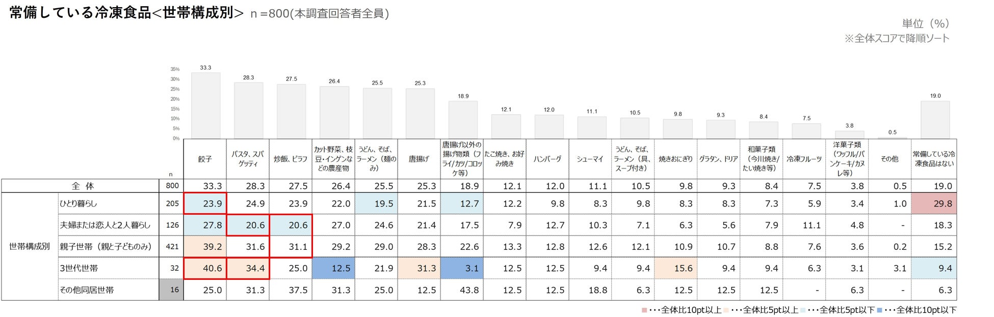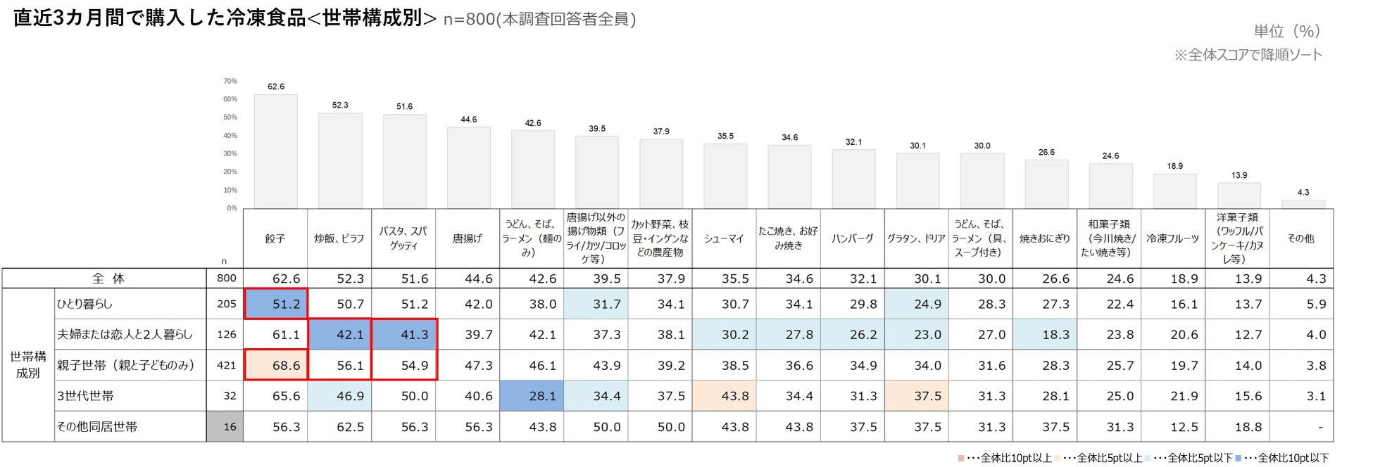 直近3カ月間で購入した冷凍食品を世帯構成別(n=800)でみると、全体での購入率が上位3品である「餃子」「炒飯、ピラフ」「パスタ、スパゲッティ」は、いずれも【親子世帯(親と子どものみ)】で最も高い購入率となった。