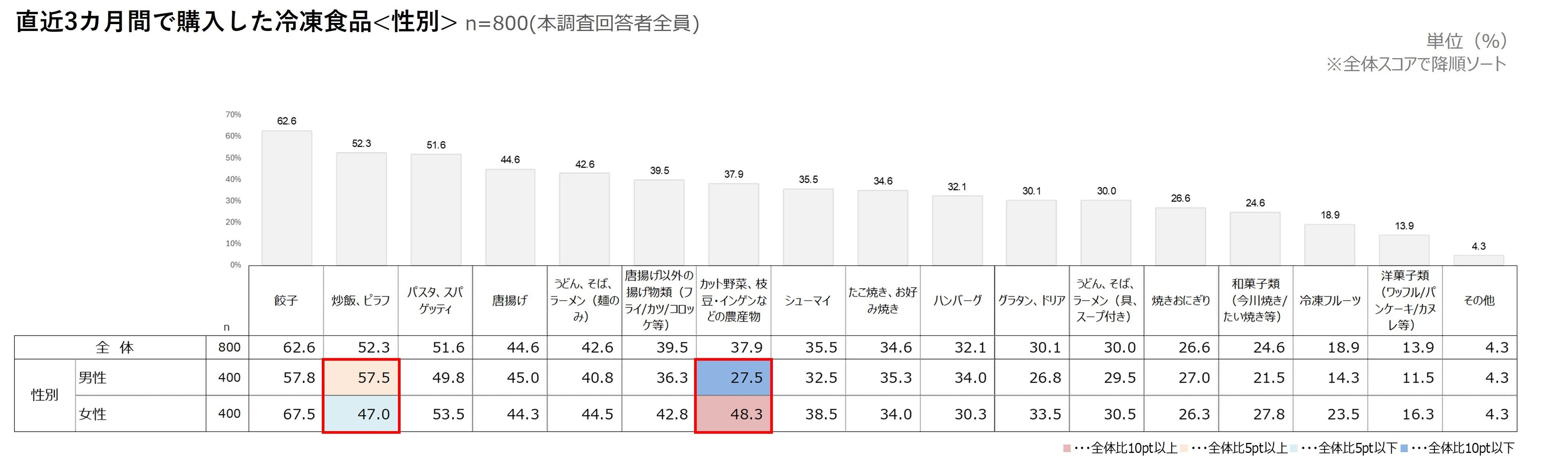 直近3カ月間で購入した冷凍食品を性別(n=800)でみると、男性では「炒飯、ピラフ(57.5%)」が女性に比べて10pt以上高かった。