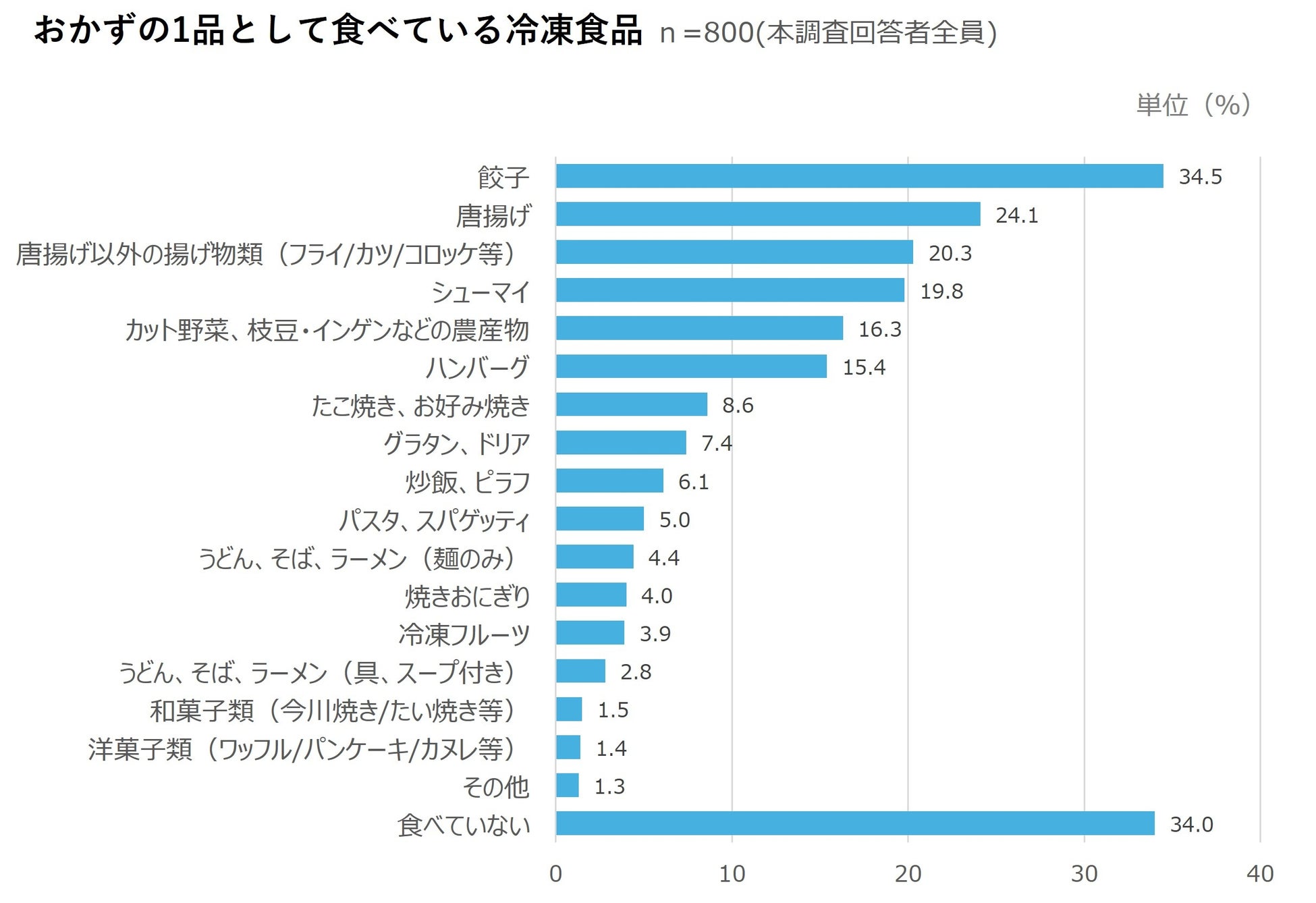 おかずの1品として食べている冷凍食品(n=800)をみると、「餃子(34.5%)」が最も多く、次いで「唐揚げ(24.1%)」、「唐揚げ以外の揚げ物類(フライ/カツ/コロッケ等)(20.3%)」と続いた。おかずの1品としては、餃子に加えて、唐揚げやフライといった揚げ物系の冷凍食品が好まれていることがわかる。