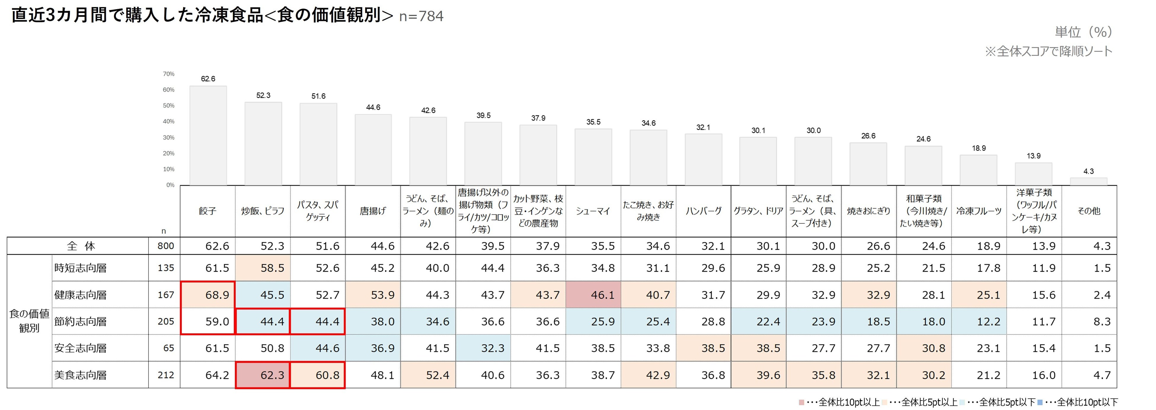 また、「炒飯、ピラフ」は【美食志向層】で62.3%と購入率が突出して高く、【節約志向層】と比べて15pt以上の差がみられた。