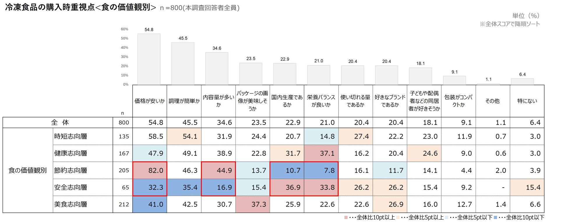 冷凍食品の購入時重視点を食の価値観別(n=800)でみると、【節約志向層】と【節約志向層】で対照的な結果が見られた。