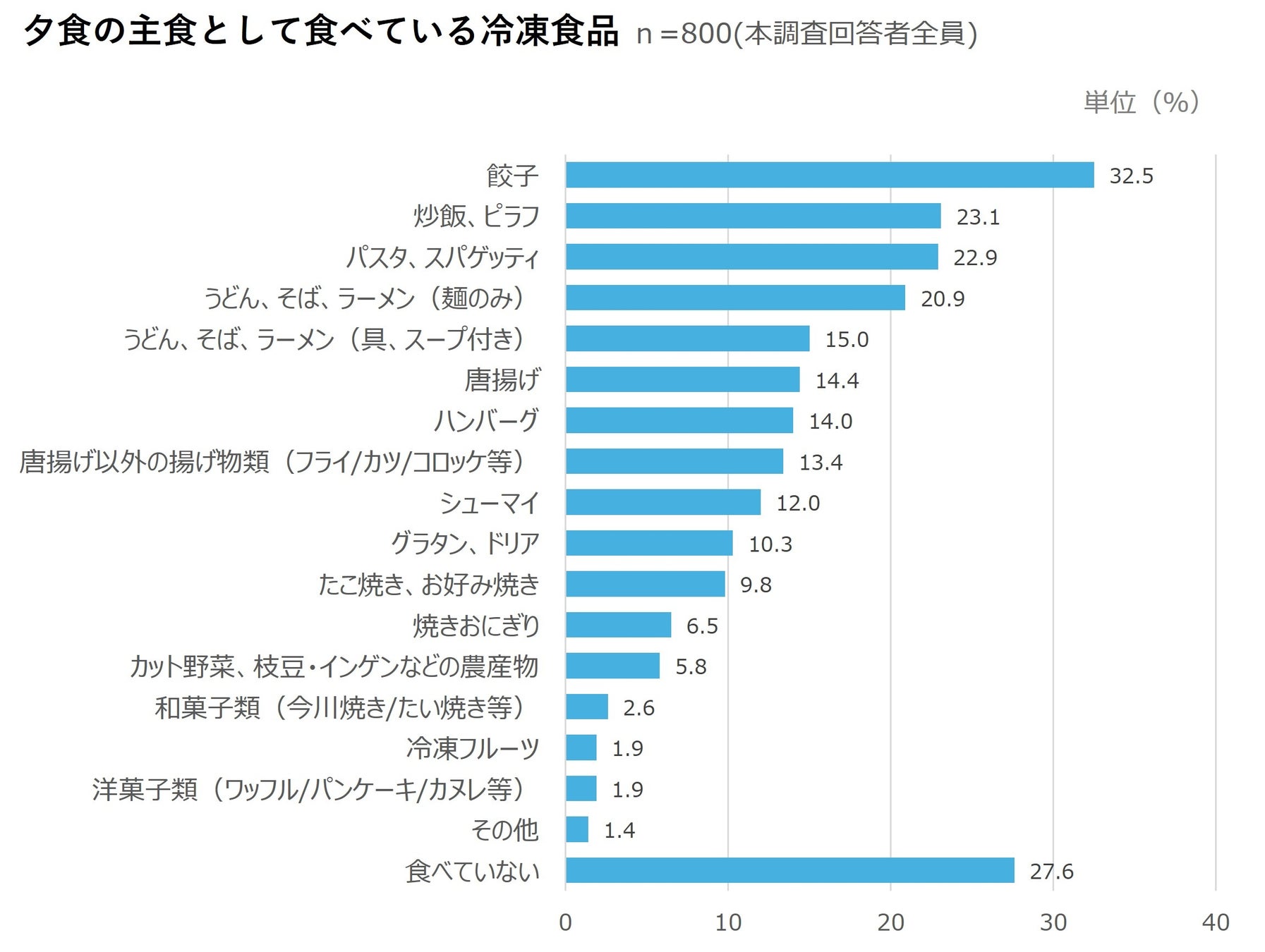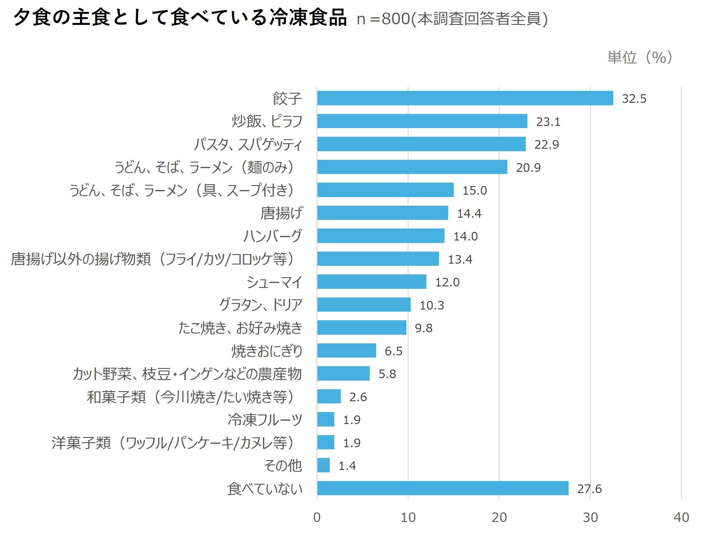 夕食の主食として食べている冷凍食品(n=800)をみると、「餃子(32.5%)」が最も多く、次いで「炒飯、ピラフ(23.1%)」、「パスタ、スパゲッティ(22.9%)」と続いた。全体での購入率が上位に挙がっていた定番の冷凍食品が、夕食の主食として広く活用されていることがわかる。