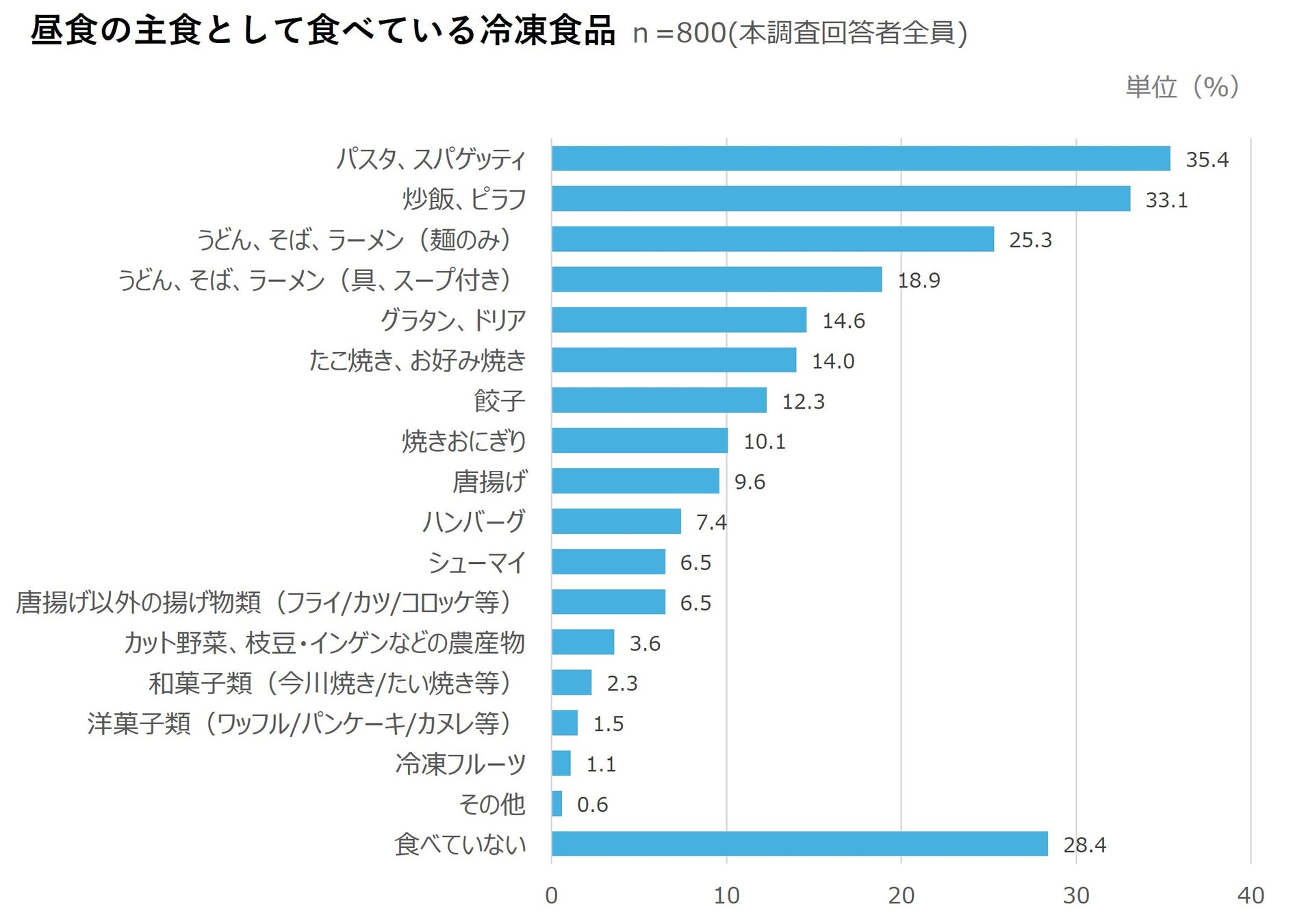 昼食の主食として食べている冷凍食品(n=800)をみると、「パスタ、スパゲッティ(35.4%)」が最も多く、次いで「炒飯、ピラフ(33.1%)」、「うどん、そば、ラーメン(麺のみ)(25.3%)」と続いた。さらに、「うどん、そば、ラーメン(具、スープ付き)(18.9%)」が4位に挙がっていることからも、昼食の主食としては麺系の冷凍食品が好まれていることがわかる。
