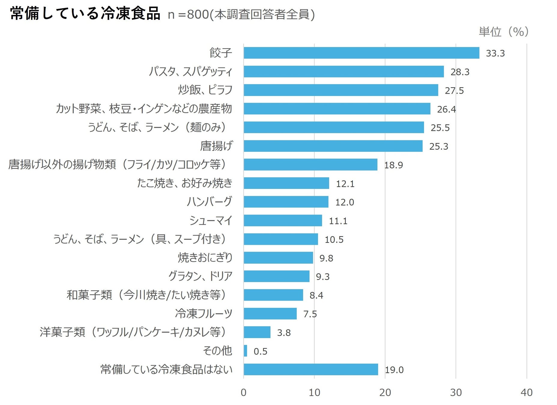冷凍庫に常備している冷凍食品(n=800)を尋ねたところ、直近3カ月以内に冷凍食品を購入したことがある人のうち、常備している冷凍食品がある人は8割を超えた。具体的な常備率については、「餃子(33.3%)」が最も多く、次いで「パスタ、スパゲッティ(28.3%)」、「炒飯、ピラフ(27.5%)」と続いた。