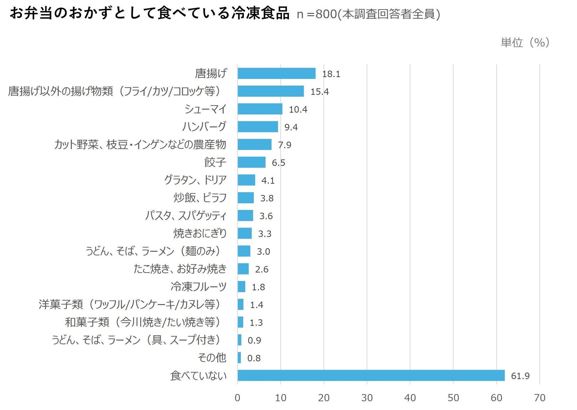 お弁当のおかずとして食べている冷凍食品(n=800)をみると、「唐揚げ(18.1%)」が最も多く、次いで「唐揚げ以外の揚げ物類(フライ/カツ/コロッケ等)(15.4%)」、「シューマイ(10.4%)」と続いた。「お弁当のおかず」も「おかずの1品」と同様に、唐揚げやフライといった揚げ物系の冷凍食品が好まれていることがわかる。