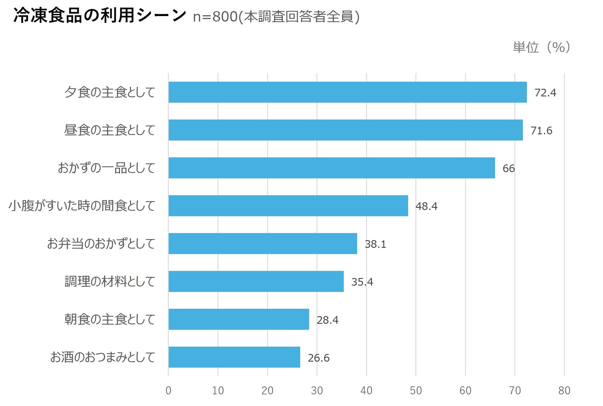 冷凍食品の利用シーン(n=800)は、第1位が「夕食の主食(72.4%)」、第2位が「昼食の主食(71.6%)」、第3位が「おかずの1品(66.0%)」となった。おかずや調理の材料といった補助的な活用にとどまらず、日常の食事での主役として、広く浸透している様子がうかがえる。