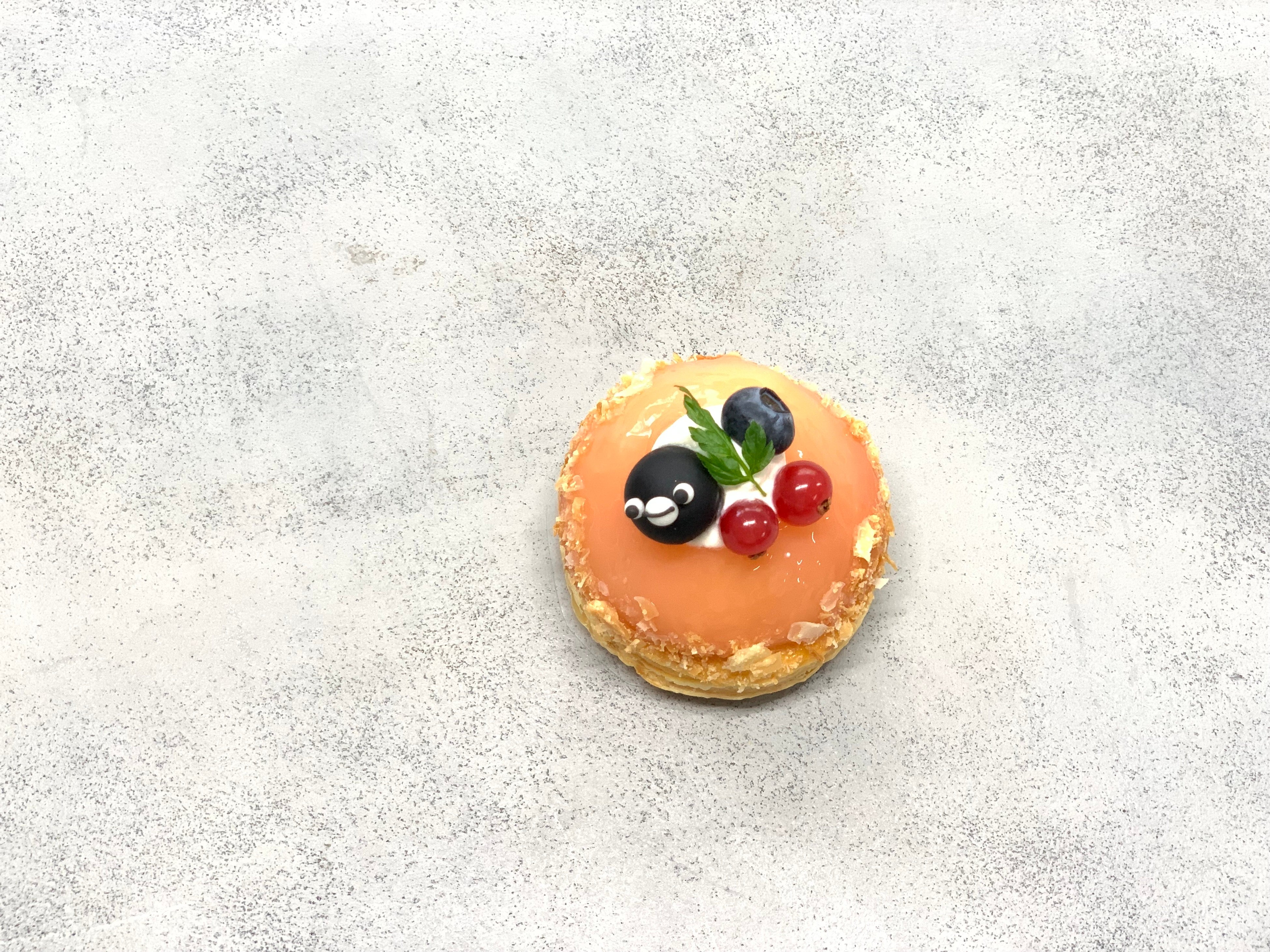 サクサクのパイの上にコンポートされたピーチ、ブルーベリーと一緒に飾られた可愛いSuicaのペンギン。