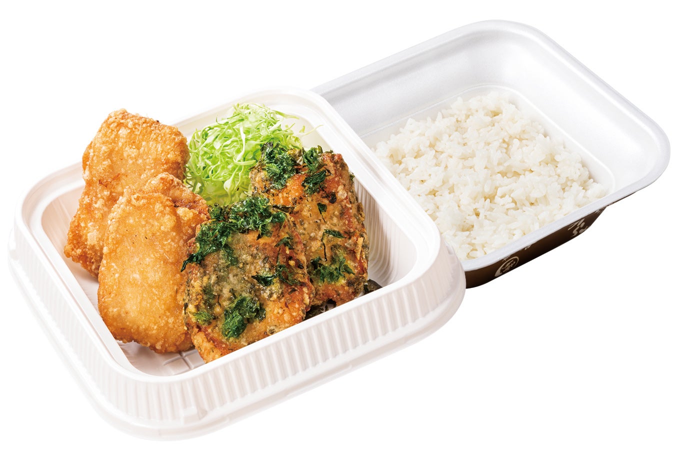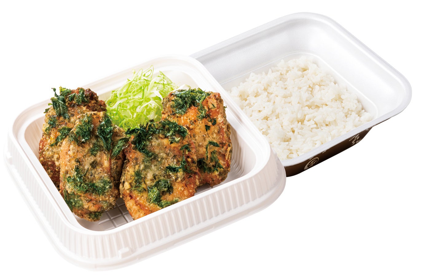 のり塩からあげ2個、カリッともも2個、千切りキャベツ、ご飯