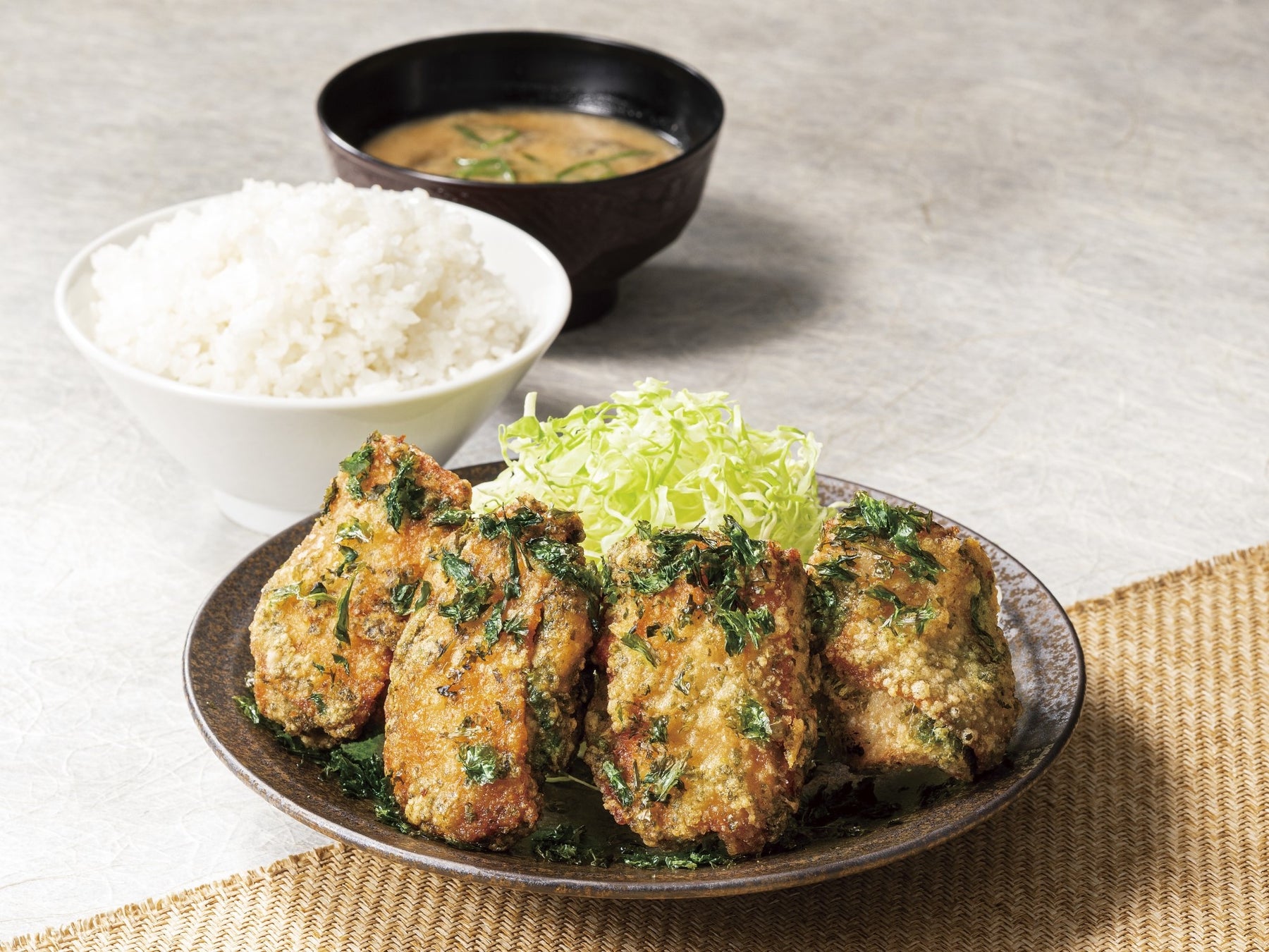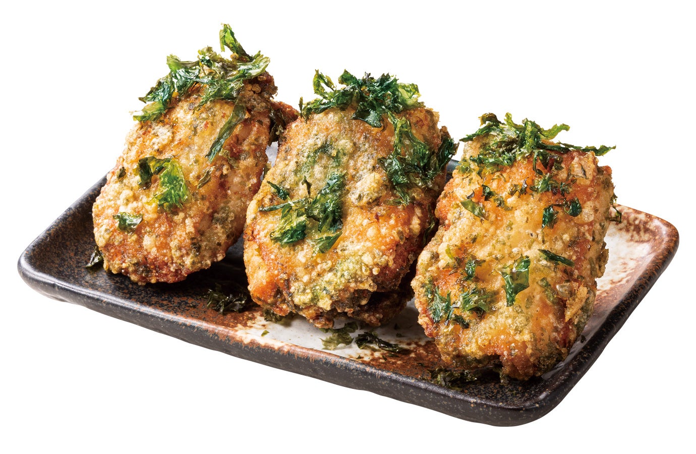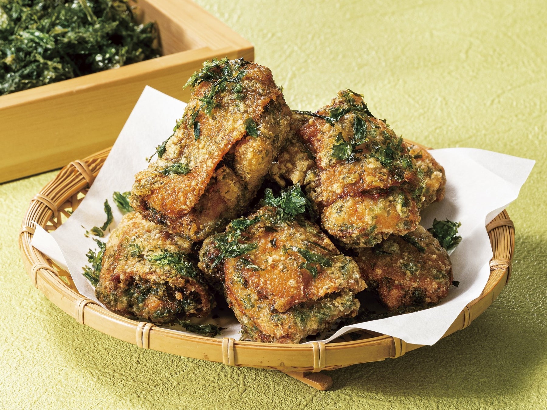 鶏もも肉を、あおさ香る塩漬け込みダレで磯の香りをまとわせサクッと揚げ、焼バラのりで風味豊かに仕上げた夏のからあげです。