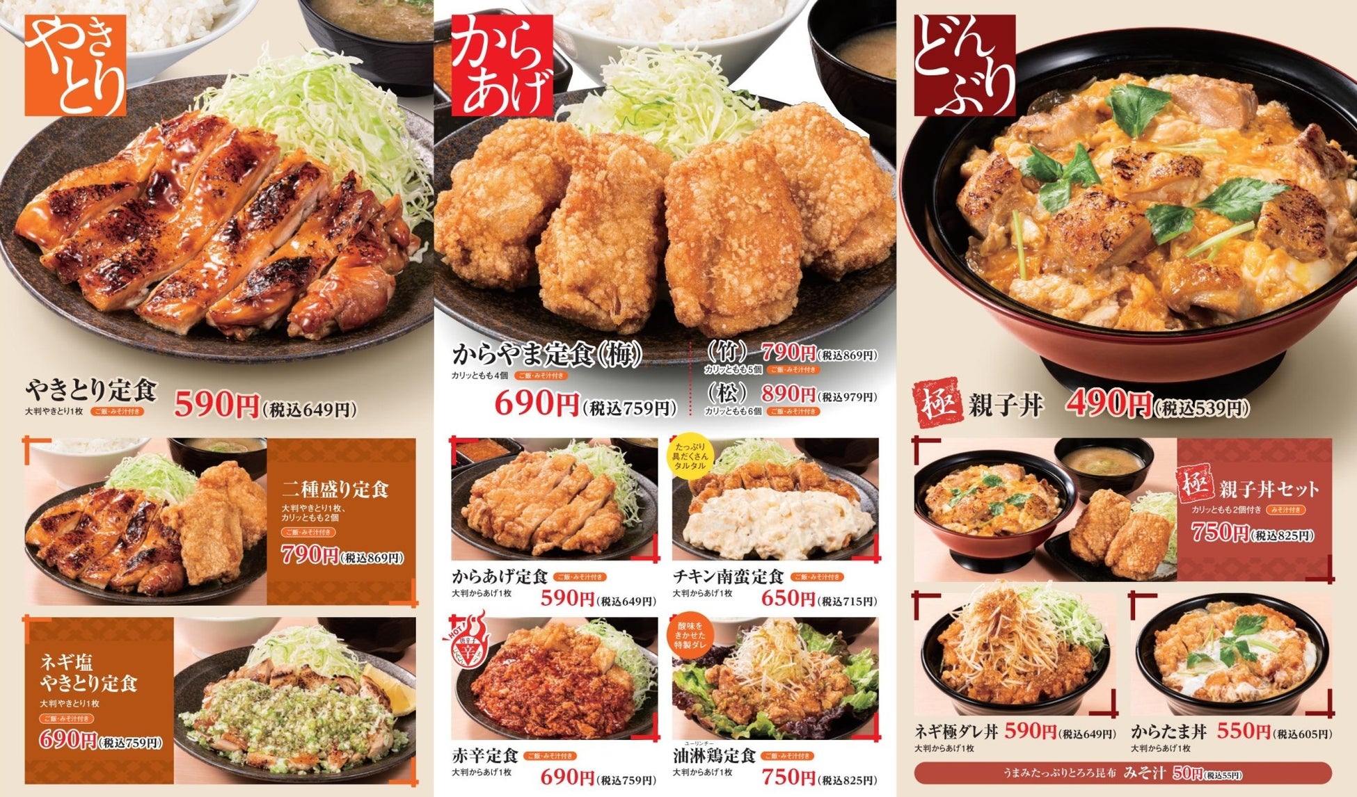 2022年3月、からあげ以外の鶏料理をもっと身近に手軽に楽しんでいただきたいと考え、⽇本⼈に愛されている「からあげ」だけでなく「親子丼」や大判の「やきとり」メニューなどが仲間入りした、新グランドメニューを販売開始いたしました。