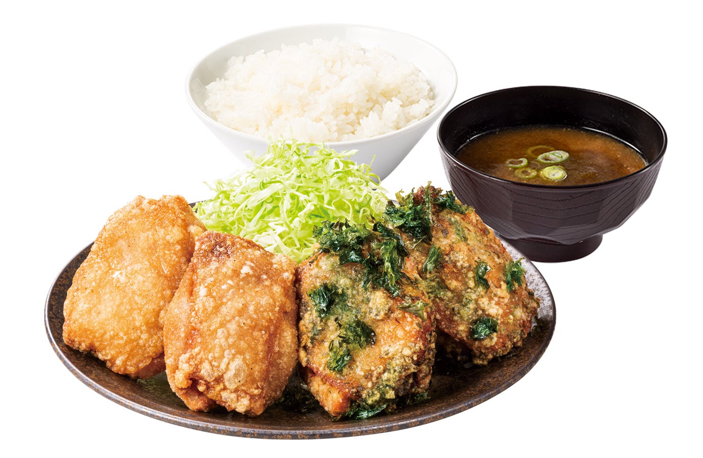 のり塩からあげ2個、カリッともも2個、千切りキャベツ、ご飯、みそ汁