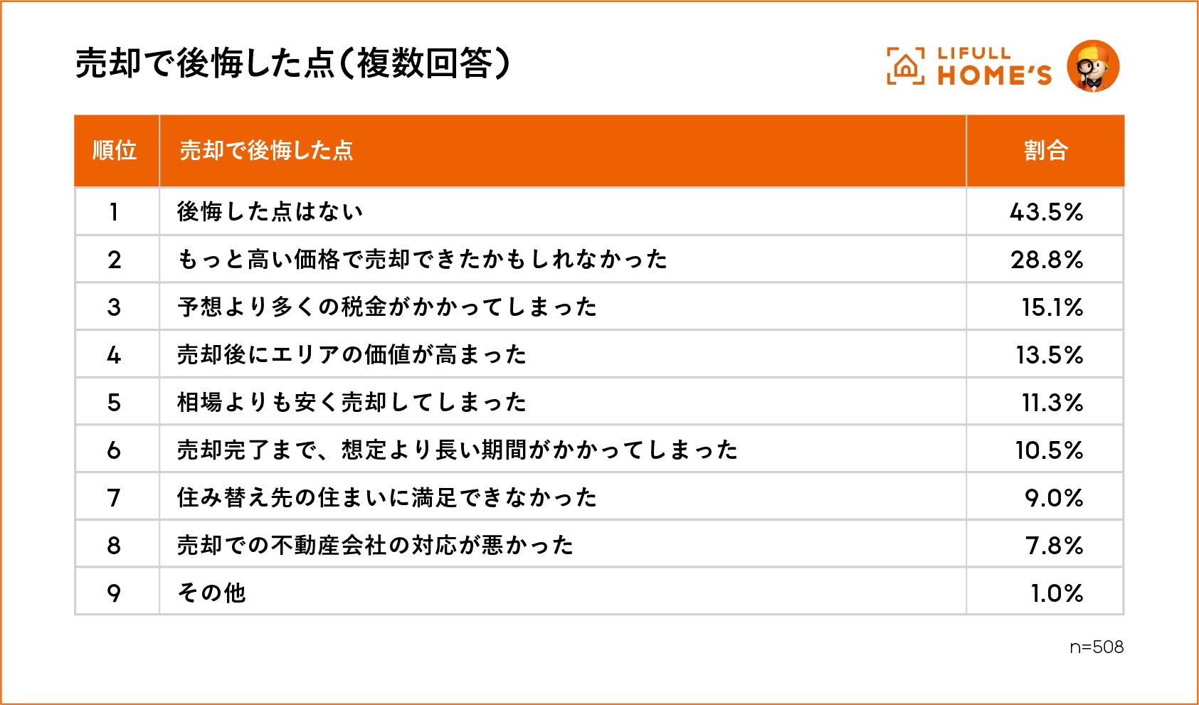 売却で後悔した点では、「後悔した点はない」(43.5%)が1位となり、多くの人が良いタイミングで納得感のある売却できたと考えていることがわかります。