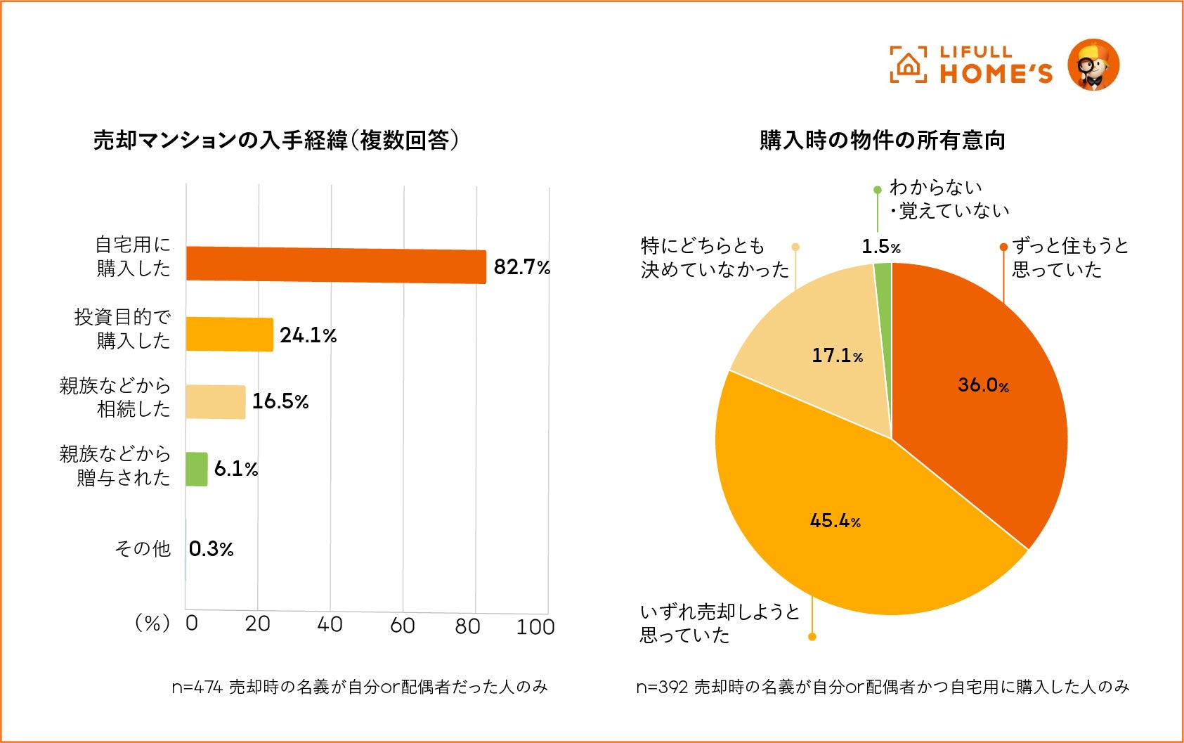 売却したマンションの入手経緯「自宅用に購入した」(82.7%)が多く、次いで「投資目的で購入した」(24.1%)となっています。また、「自宅用に購入した」したと回答した方に、購入時の物件所有意向は「いずれ売却しようと思っていた」(45.4%)が「ずっと住もうと思っていた」(36.0%)を上まっています。この結果から東京圏のマンションには、売却前提で購入する層が一定数いることがわかります。
