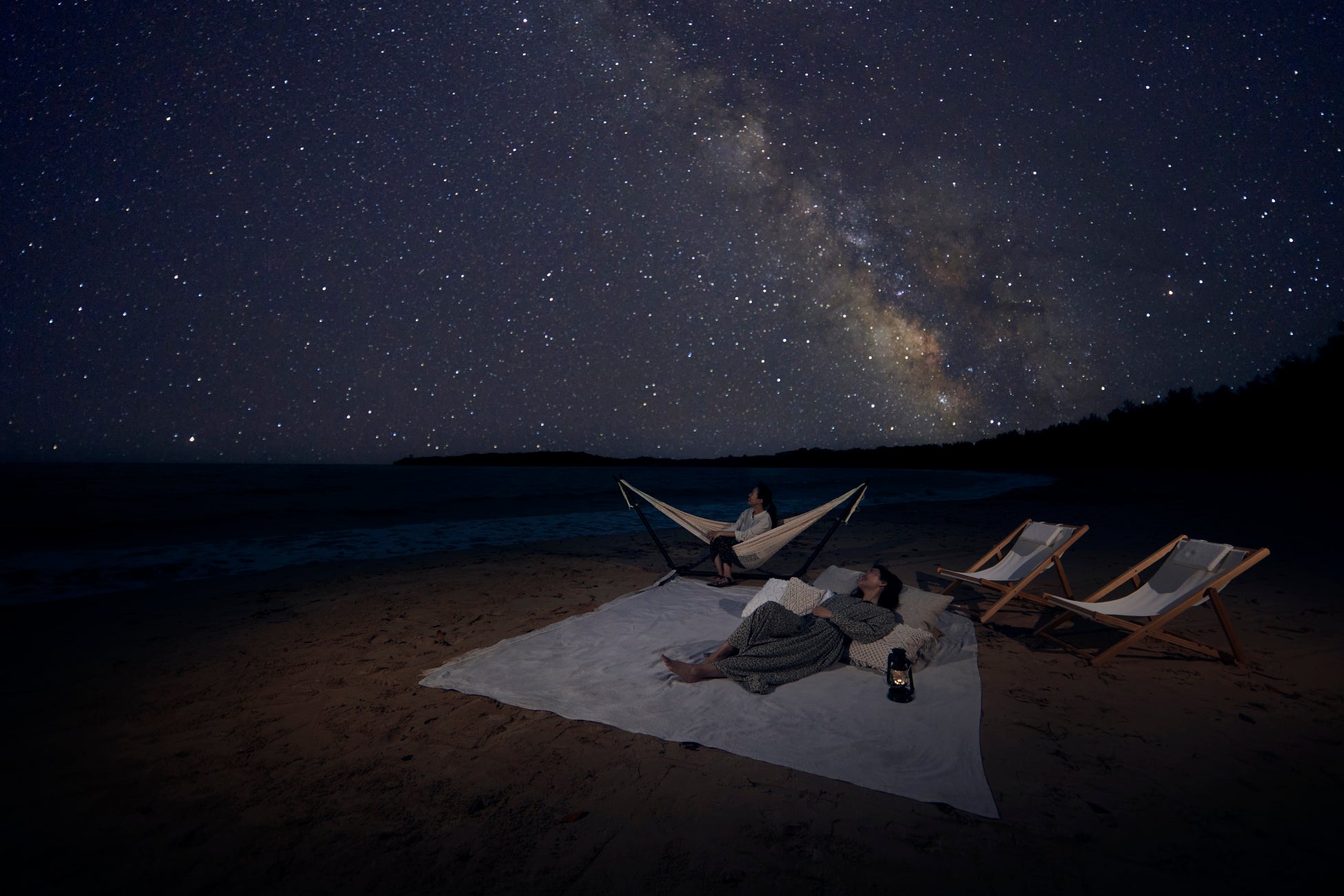 ホテル目の前のビーチ「月ヶ浜」では、真上から水平線まで星空が広がり、プラネタリウムを超える自然の絶景を楽しめます。その「月ヶ浜」に、ビーチマットやクッションなどを設えた、星空を快適に楽しむための空間を用意。ハンモックやビーチマットに寝転びながら鑑賞できるので、長時間でもゆったりと星空を楽しめます。波の音に耳を傾けながら星を眺める、贅沢な時間を過ごせます。