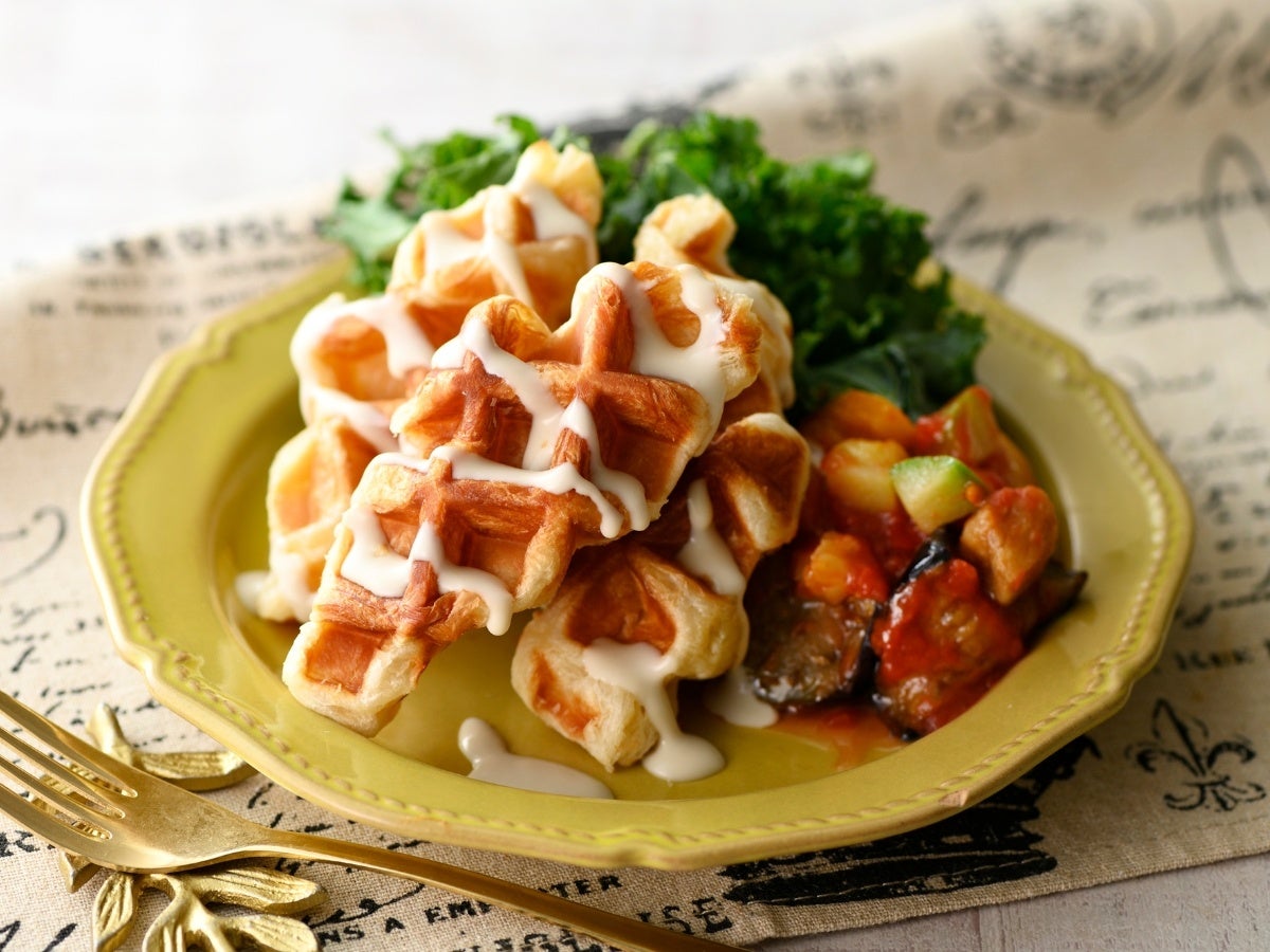 ほんのり甘いクロワッサン生地は、サラダとも相性抜群!色鮮やかなデリ達と、さっぱりドレッシングを纏わせればお食事系『クロッフル』の完成!