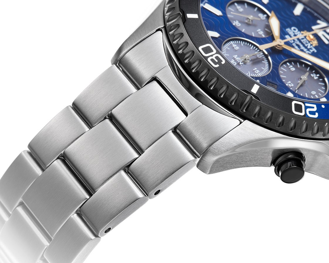 ダイバーズウオッチの意匠を持つモデルは、オリエントの歴史において1960 年代から⻑年にわたる系譜を築いてきた代表作です。裏ぶたにドルフィンアイコンを配し、「オリエントマコ」の愛称で親しまれてきた本シリーズは、2004 年の登場から⽂字板のカラーやディテールに多彩なバリエーションを展開しながら、今年で20 周年を迎えました。2023 年4 ⽉より機械式のみで展開するシリーズに仲間⼊りしたクロノグラフモデルは、太陽などの光源などから得たエネルギーを電気エネルギーに変換して時計を駆動する光充電式を採⽤。定期的な電池交換が不要なため、⽇常づかいに便利なだけでなく、アウトドアなどでクロノグラフ機能を頻繁に使⽤する際にも重宝します。