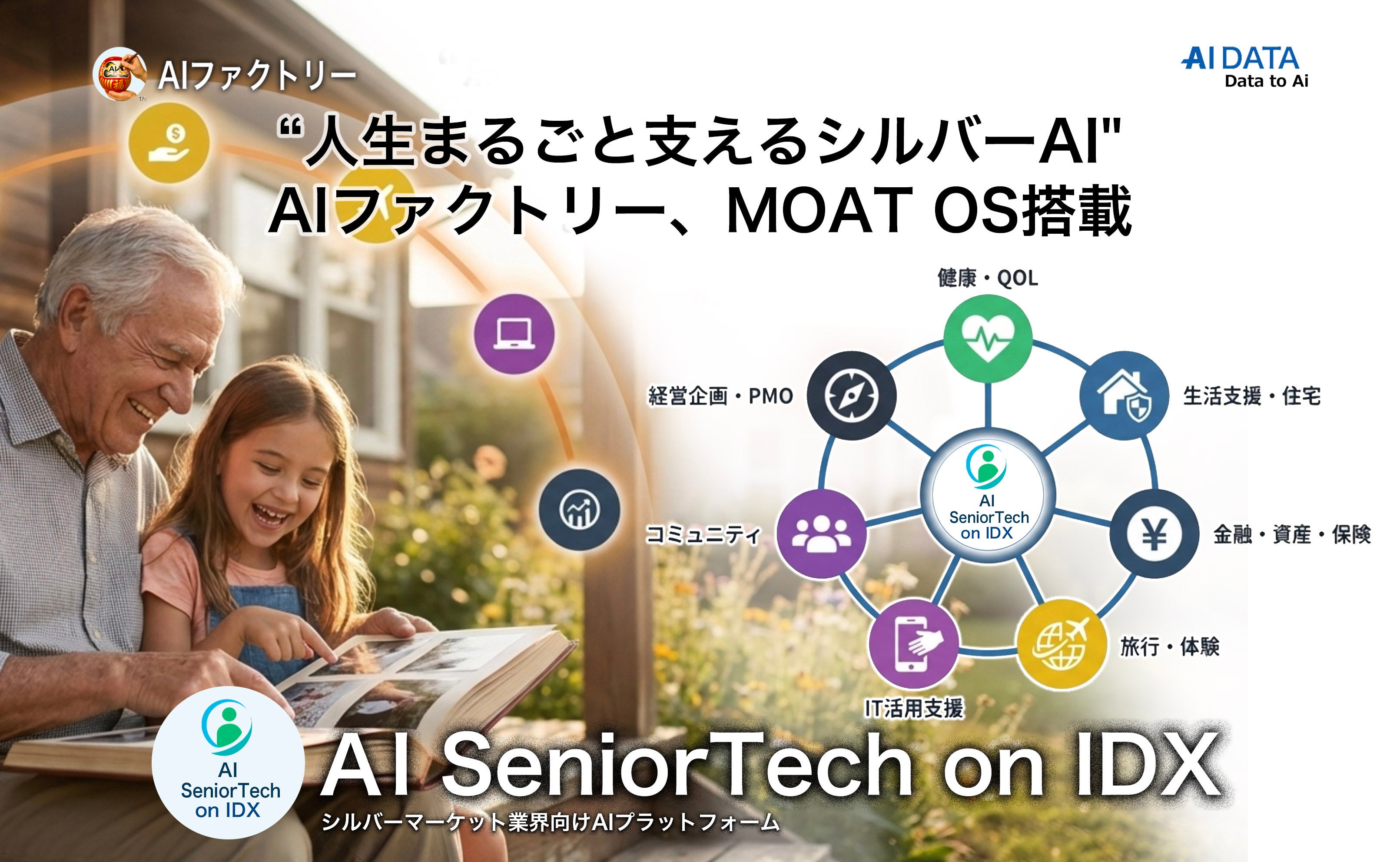 企業データとAIの利活用カンパニー、AIデータ株式会社(本社:東京都港区、代表取締役社長 佐々木隆仁、以下AIデータ社)は、シルバーマーケットの縦割り運営を解決し、高齢者一人ひとりの人生価値と事業の持続的成長を実現する次世代シルバーマーケット参謀プラットフォーム「AI SeniorTech on IDX」に、新たに7参謀×MOAT OSの新アーキテクトを発表いたします。