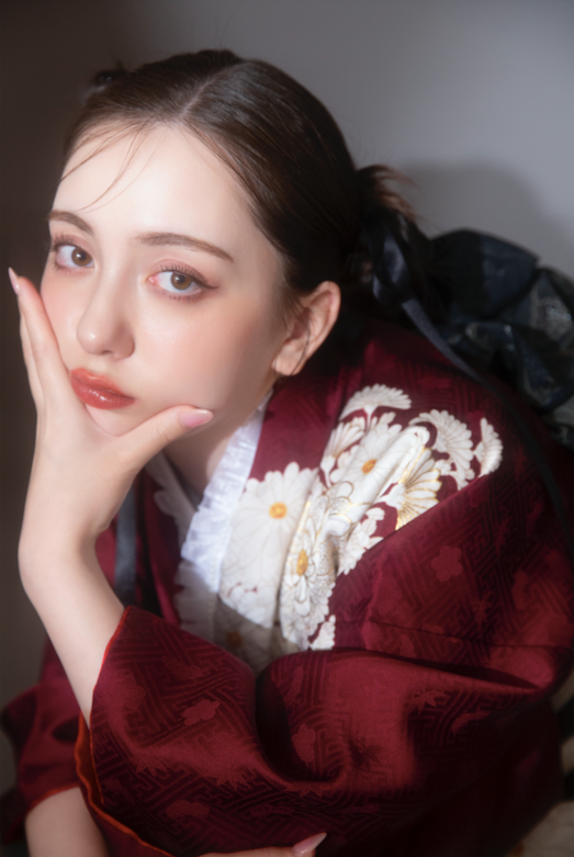 メイクはボルドー系のアイシャドウを使用し振袖との統一感を。