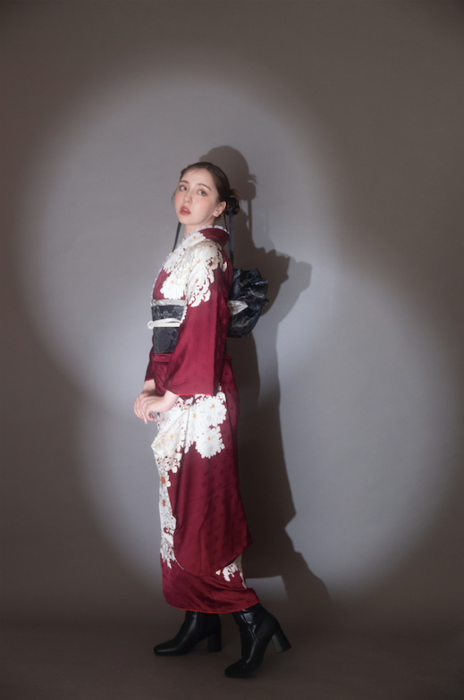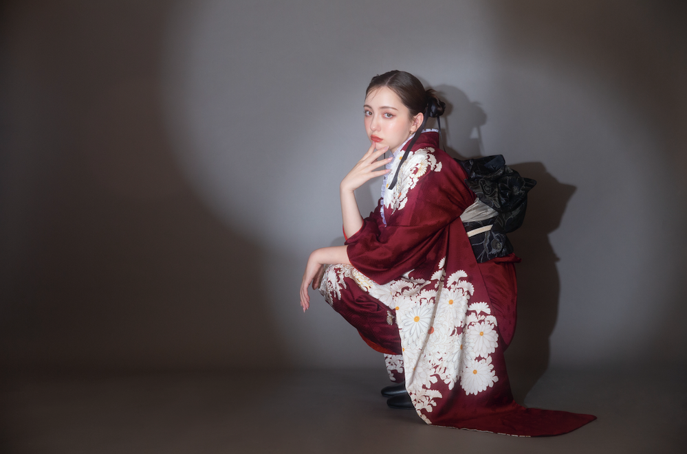 コーディネートは、赤の振袖に黒い帯で引き締まった印象に。