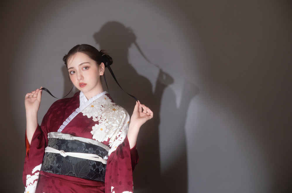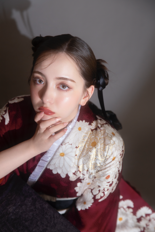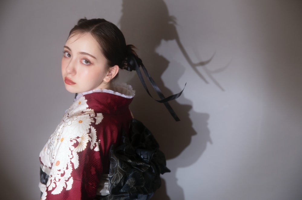 ヘアスタイルは高さの違うツインのお団子にリボンをつけ、二十歳らしく。