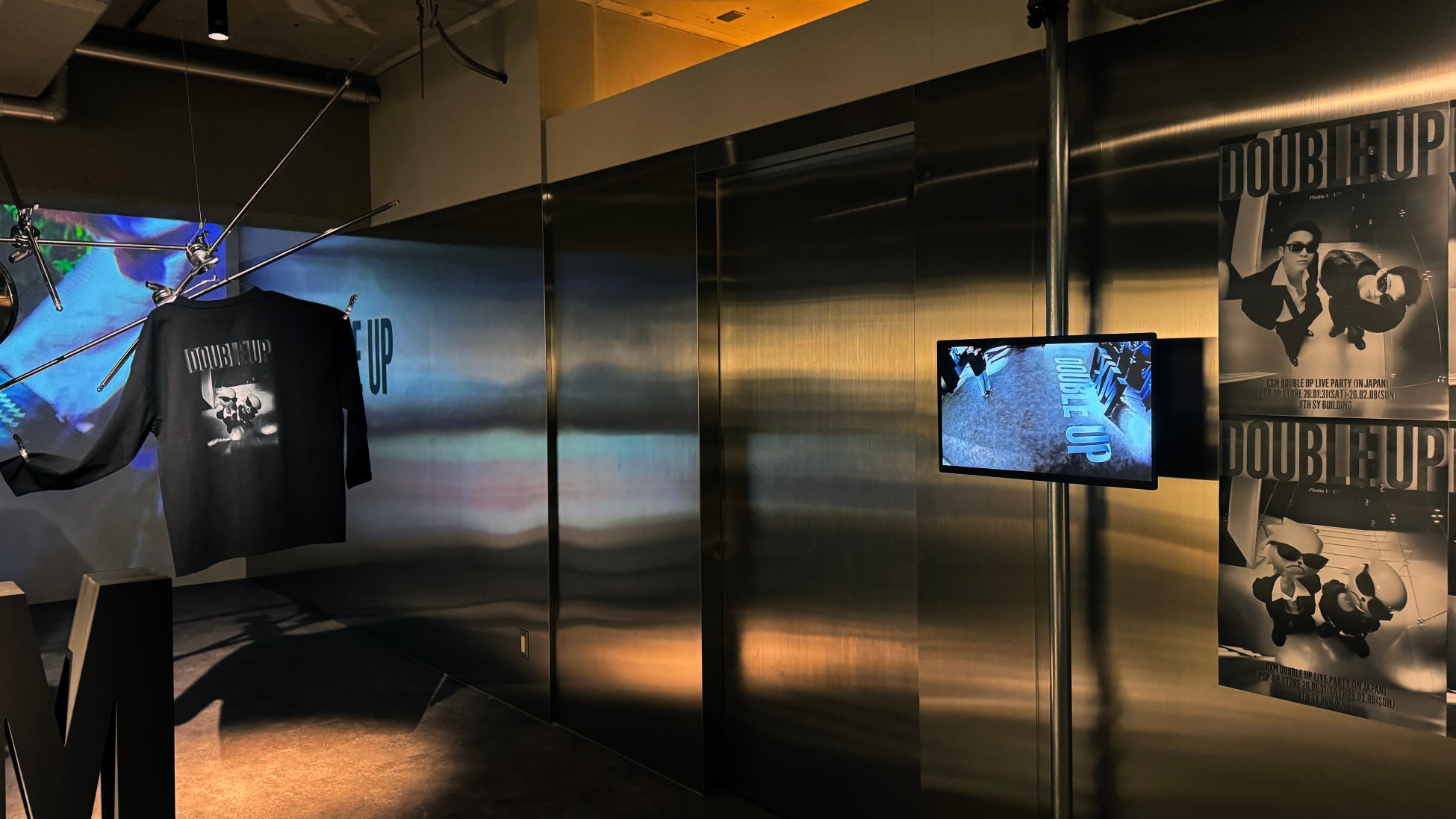 POP-UP STOREに入ると、今回の公演のタイトルをモチーフにデザインされたロゴと商品が組み合わさった大きなディスプレイが目に入ります。その横には、まるでアパレルショップのように配置された商品が飾られています。照明も通常の照明では無く、ピンスポットのみの、少し暗い雰囲気で、公演のポスターの世界を再現しています。公演のポスターはパーティー会場の入口の監視カメラで撮影したようなイメージでデザインされているのですが、本POP-UP STOREではCxM (SEVENTEEN)と同じような画角で監視カメラに映ることができるスペースもあり、足を踏み入れただけで『CxM [DOUBLE UP] LIVE PARTY』の世界に没入できる店内となっています。
