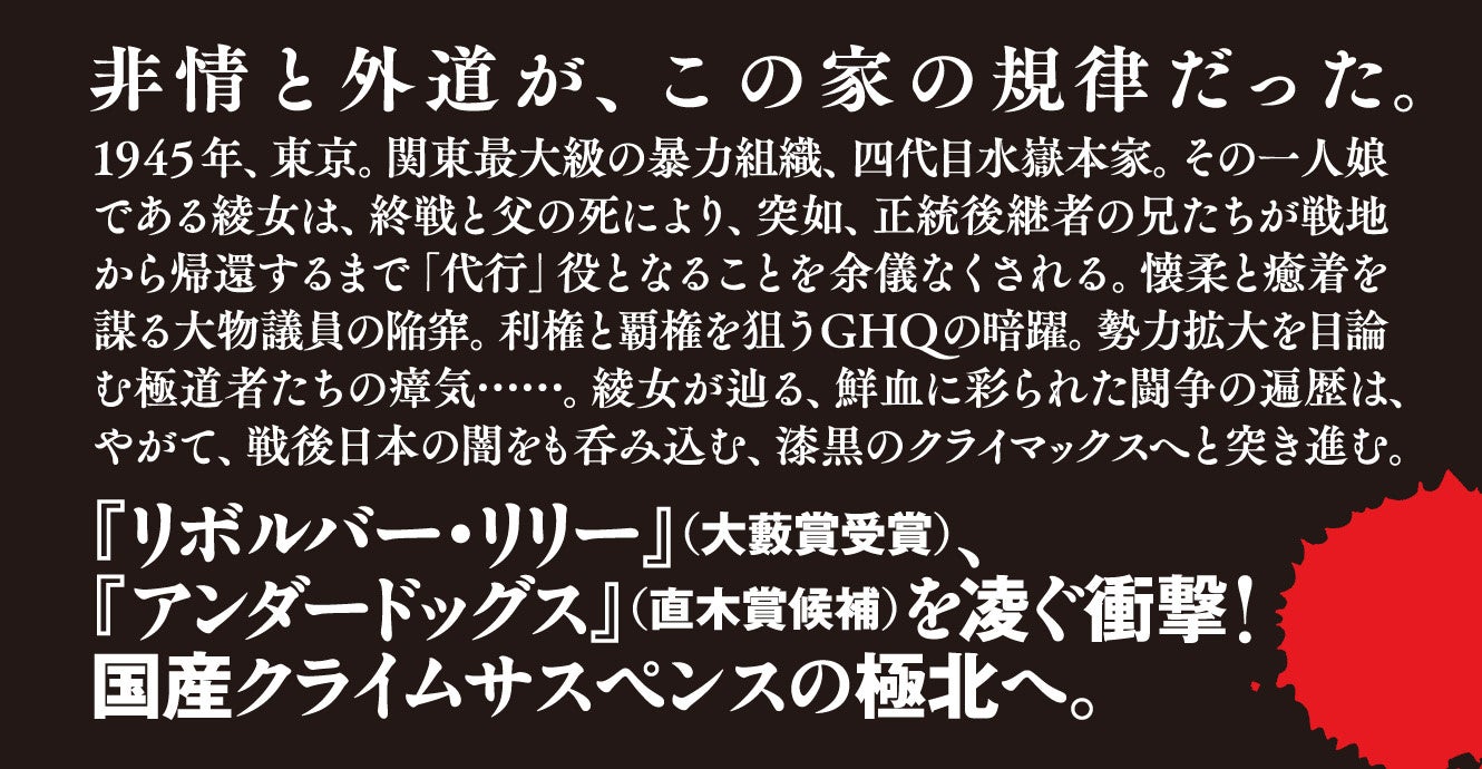 1945年、東京。関東最大級の暴力組織、四代目水嶽(みたけ)本家。その一人娘である綾女(あやめ)は、終戦と父の死により、突如、正統後継者の兄たちが戦地から帰還するまで「代行」役となることを余儀なくされる。懐柔と癒着を謀る大物議員の陥穽。利権と覇権を狙うGHQの暗躍。勢力拡大を目論む極道者たちの瘴気……。幾多の謀略を経て、次第に権力と暴力の魔力に魅せられていく綾女。そして、鮮血に彩られた闘争の遍歴は、やがて、戦後日本の闇をも呑み込む、漆黒のクライマックスへと突き進み……。『リボルバー・リリー』(大藪賞受賞)、『アンダードッグス』(直木賞候補)を凌ぐ衝撃! 国産クライムサスペンスの極北へ――。