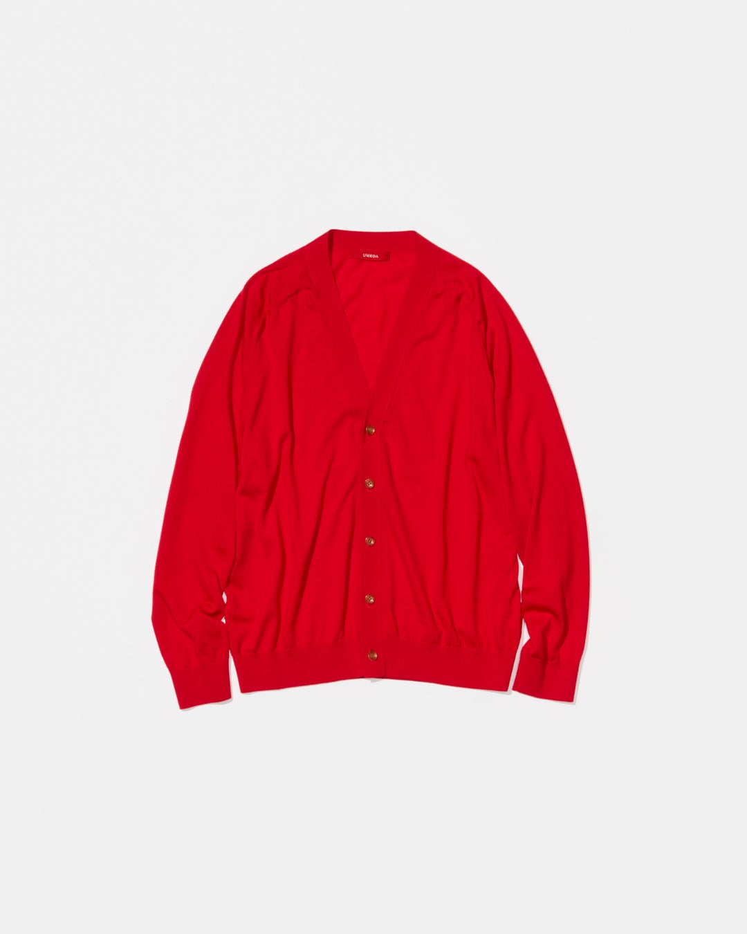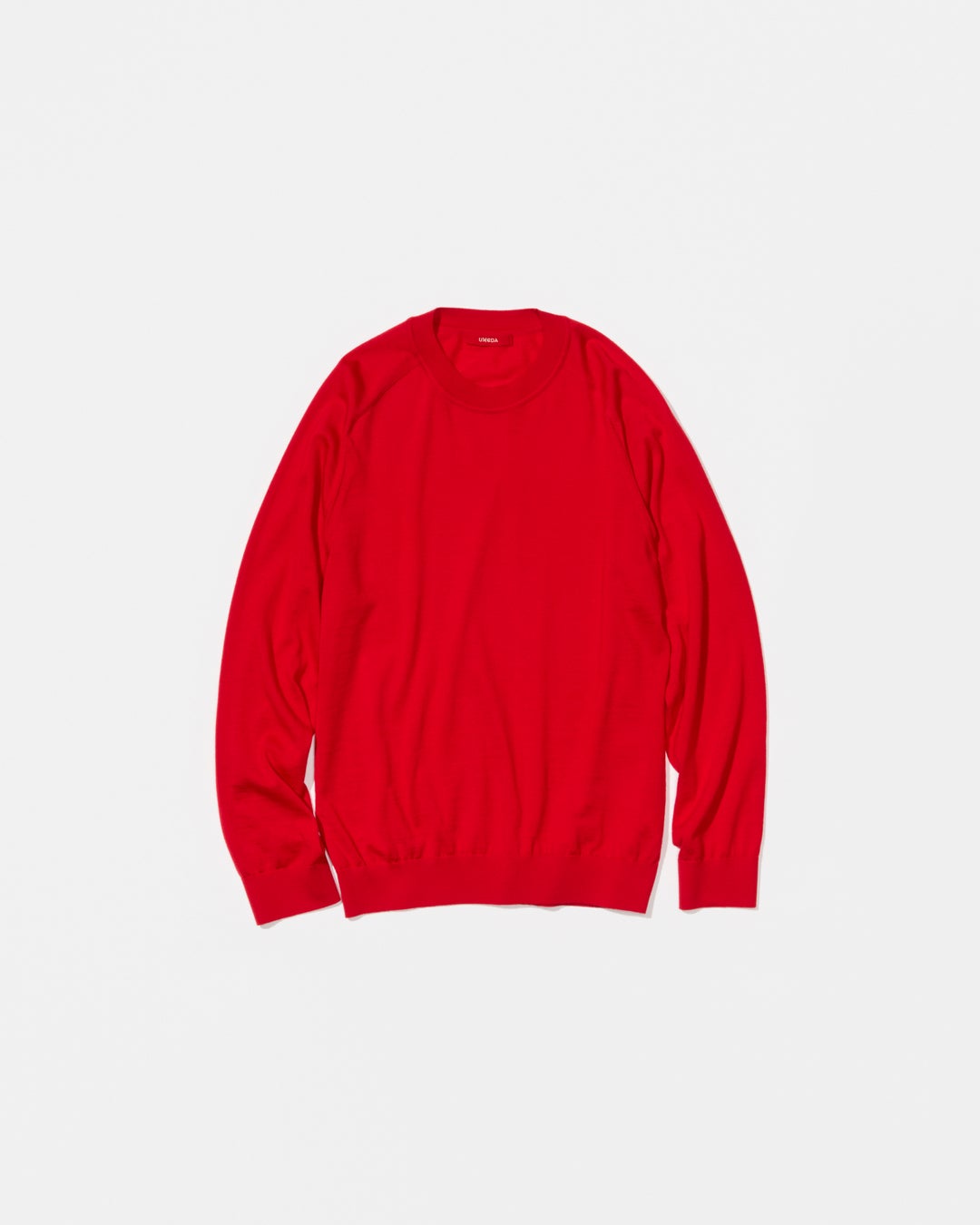 インラインで展開している16ゲージ クルーネックプルオーバーとVネックカーディガンの2型をベースに、発⾊の良い鮮やかな⾚にカラー別注。