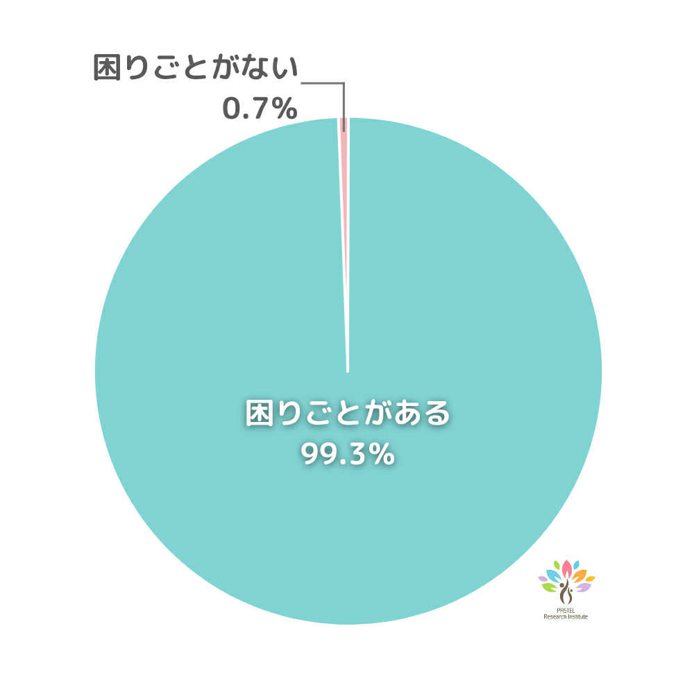 「現在、お子さんに困りごとはありますか?」という質問に対し、99.3%が「困りごとがある」と回答しました。困りごとが「ない」と答えた方はわずか1名でした。つまり、ほとんどのご家庭で何らかの困りごとを抱えていることが明らかになりました。