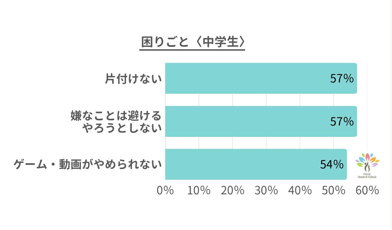 上位に上がった困りごとを見ると、日常の行動面や感情のコントロールに関する難しさが目立っています。 「ゲーム動画がやめられない」は最多で、現実の生活よりもデジタル環境に気持ちが向いている様子がうかがえます。